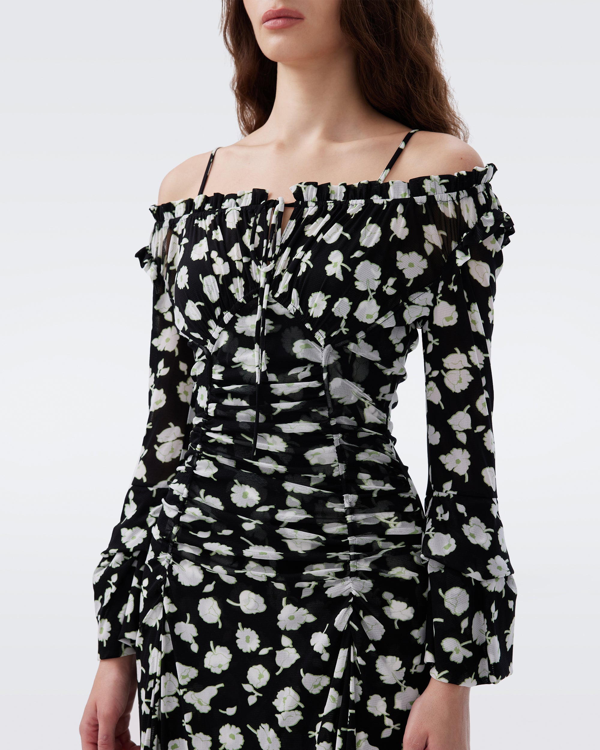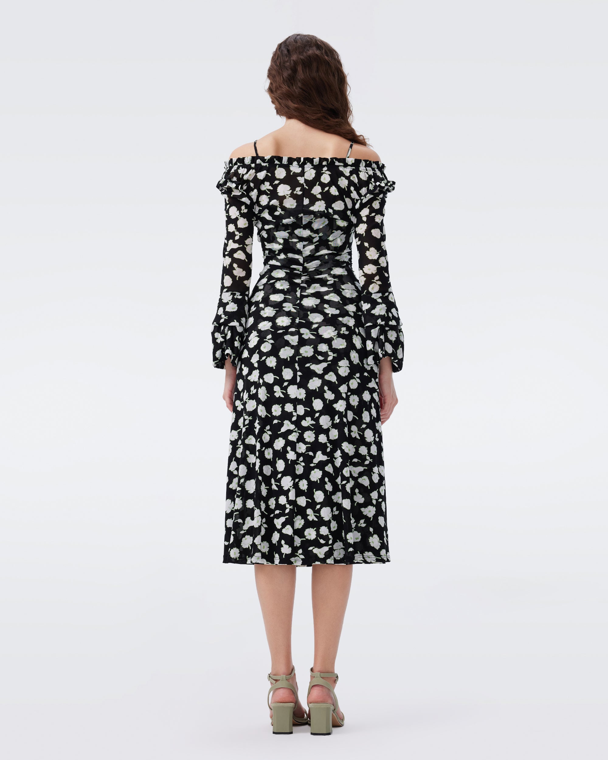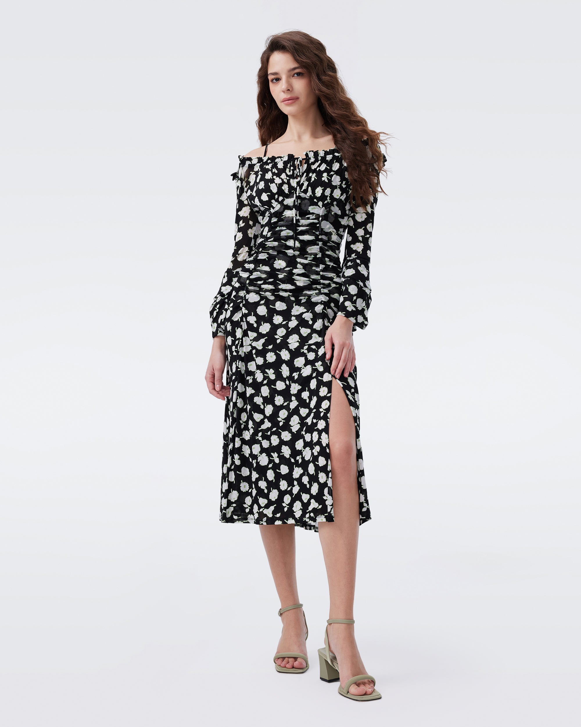 The off-the-shoulder dress is combined with a camisole dress. The slightly flared cuffs add a soft touch. The gathered waist of the dress cinches in to highlight the curves, and the side slits at the hem add a lively feel. The knee-length design is suitable for various occasions, and the overall fit combines elegance with practicality.