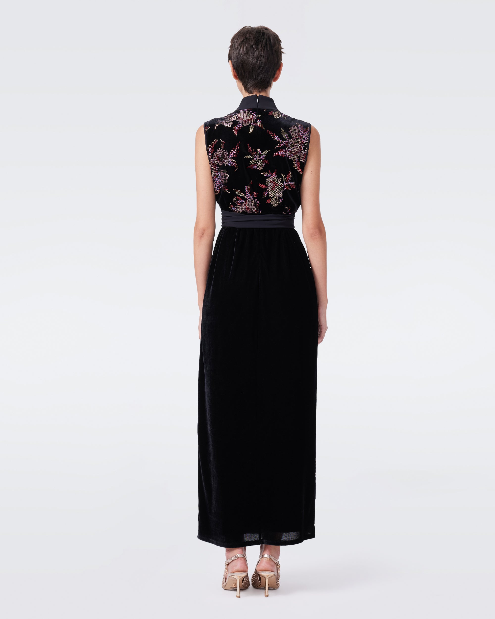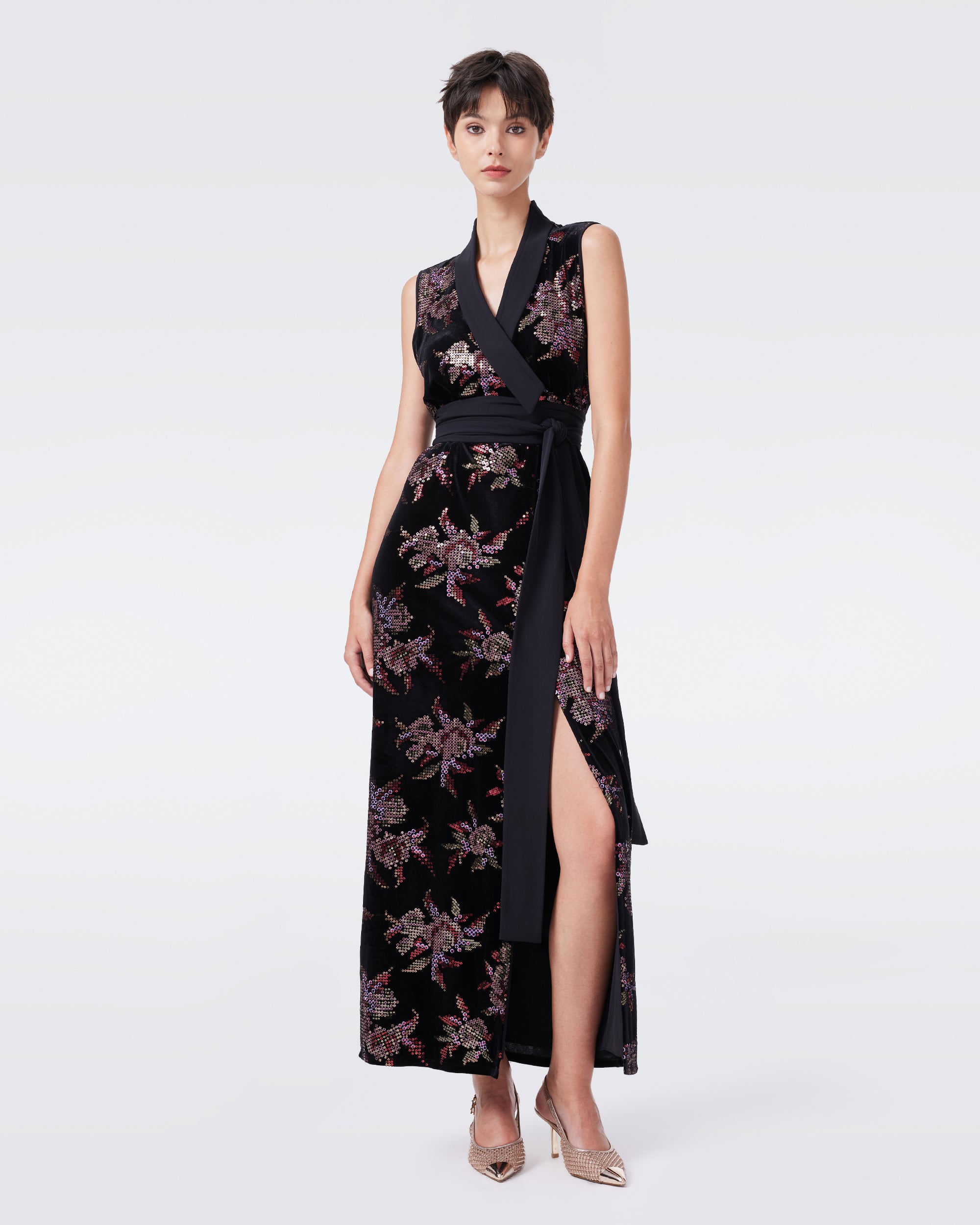This fitted sleeveless long wrap dress has a V-neck. It makes your neck line look nice and adds a neat feel. The sleeveless design shows your arms, looking light. A wide black belt cinches the waist to highlight it. The split hem adds liveliness. The whole dress looks fancy and high-end, creating a eye-catching look.Made of sequined velvet, it feels comfortable and shines.