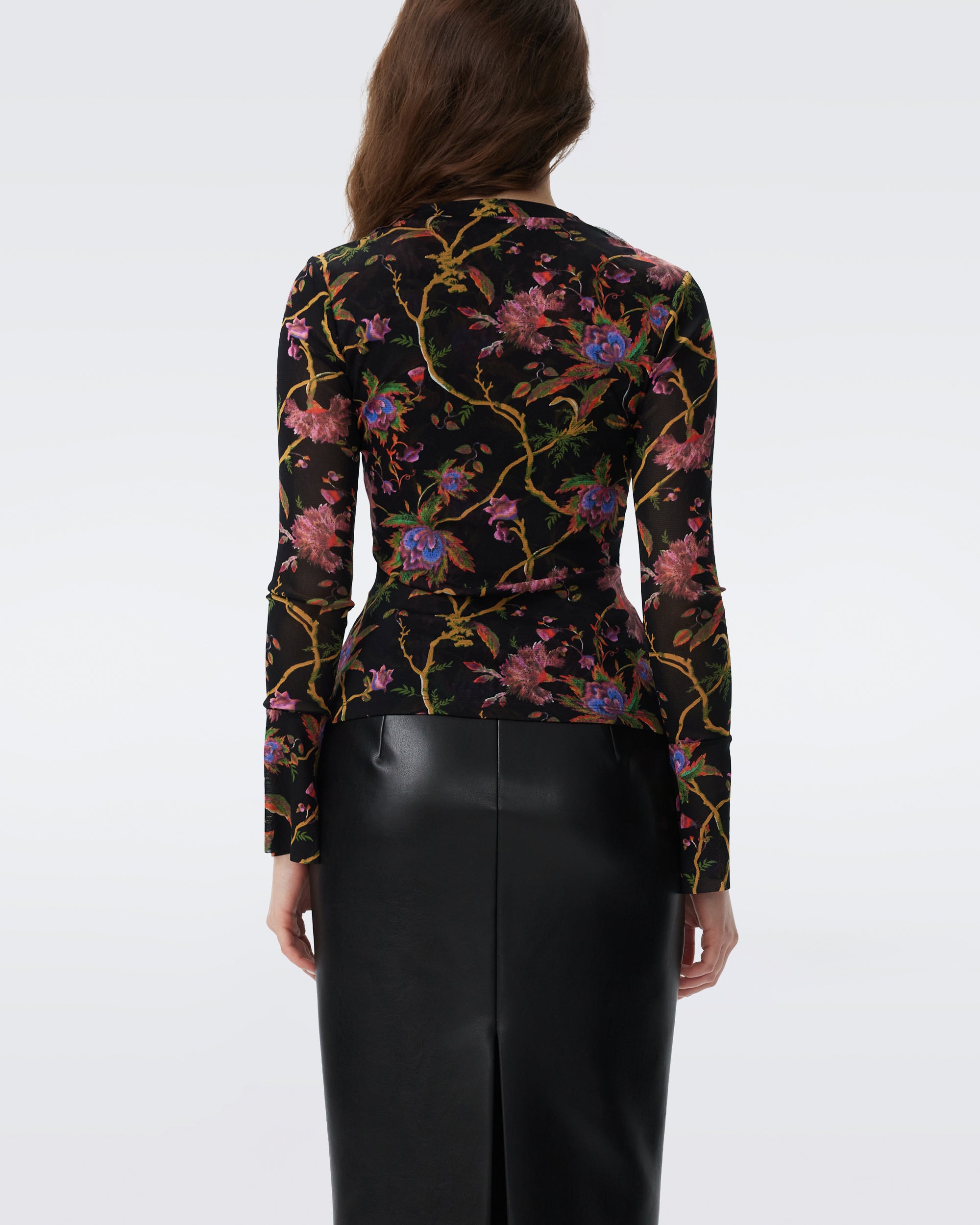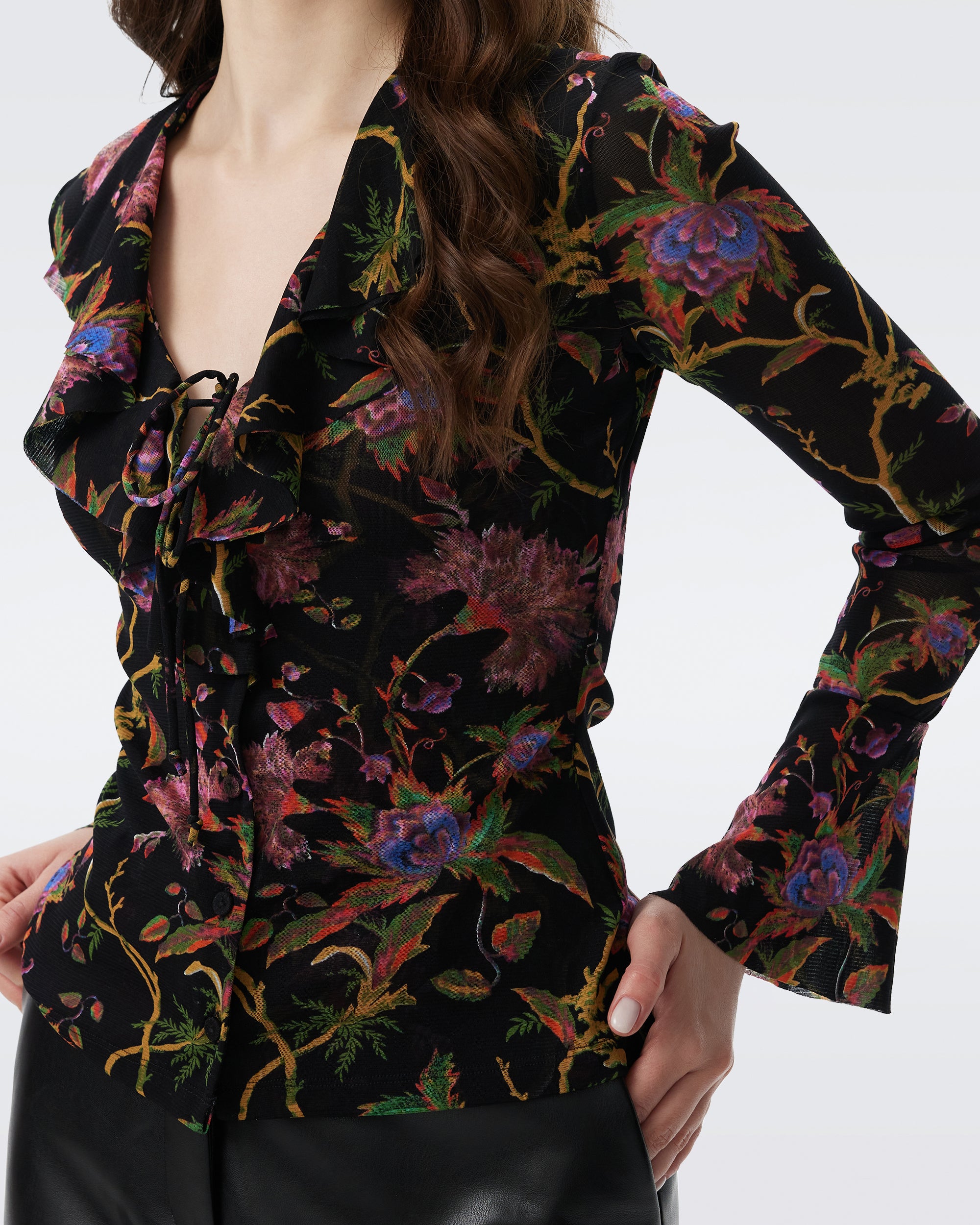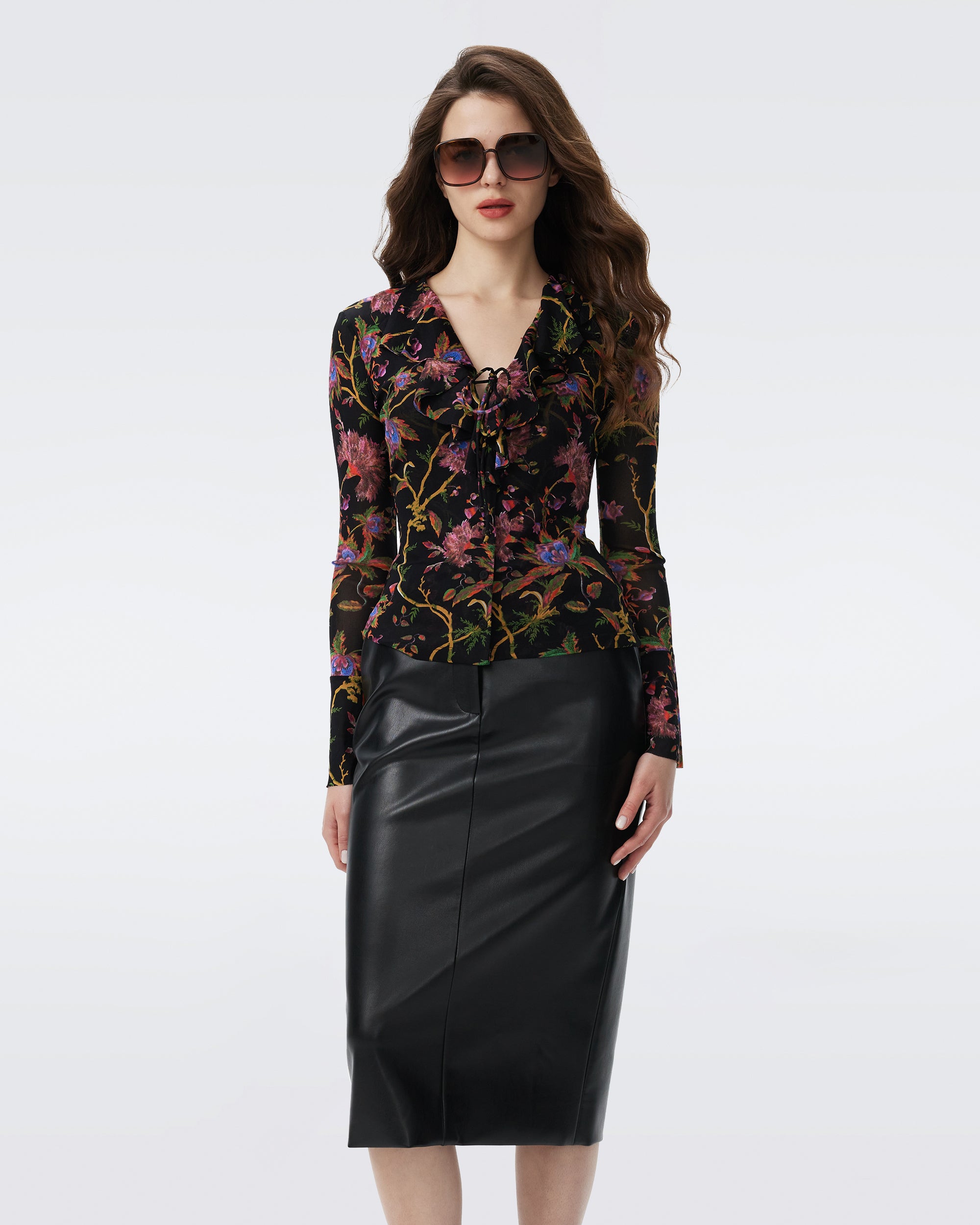 Made of lightweight mesh fabric—soft, smooth, slightly sheer for a hazy beauty. Black base with SERENISSIMA MED prints, romantic and stylish. Slim fit, V - neck shows curves. Ruffles add sweetness. Pair with jeans for outings, or skirts/heels for parties.