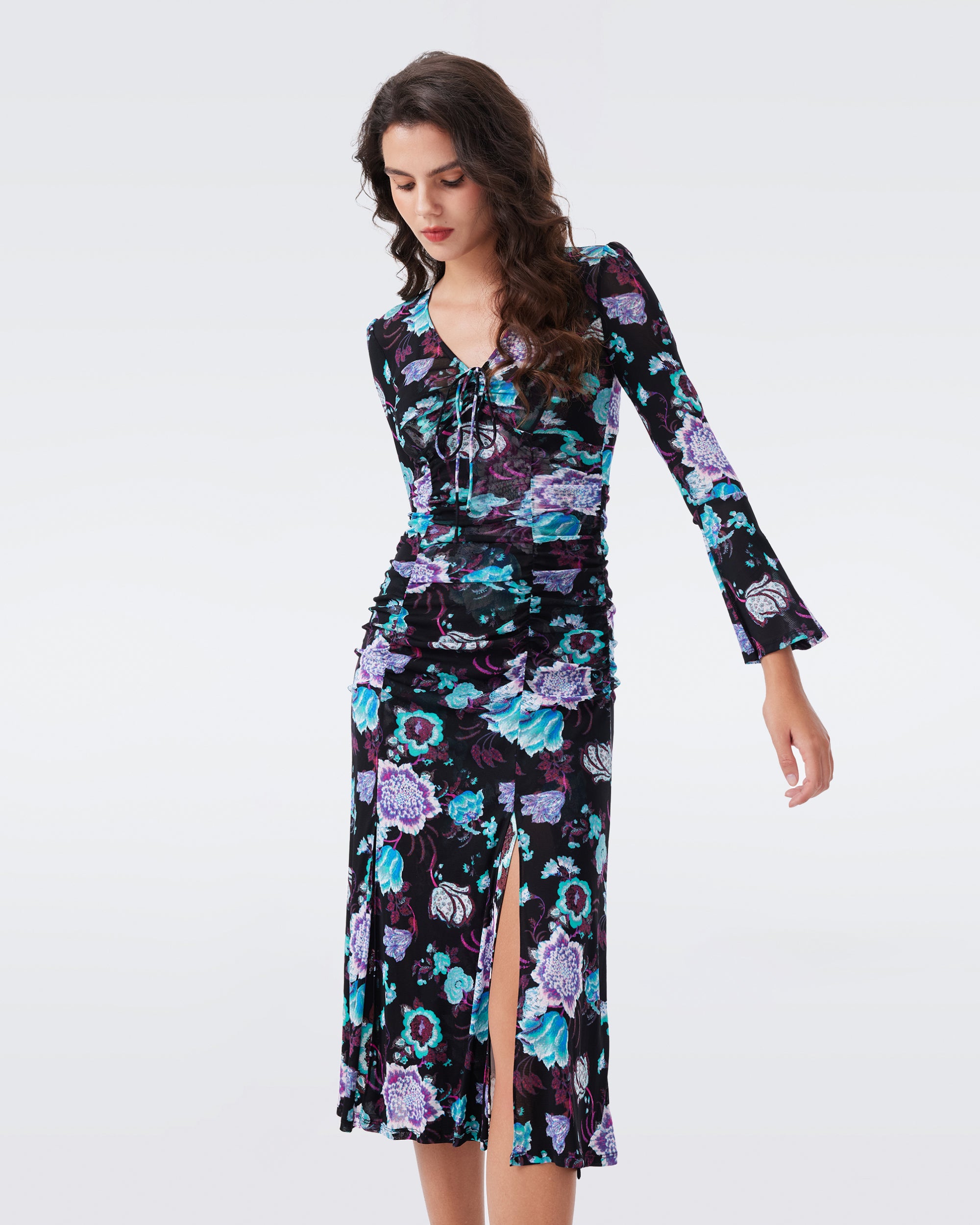 This dress has a slim-fit midi cut, featuring a V-neck with a tie detail and flared long sleeves. It's made of mesh fabric that feels smooth and boasts excellent stretch. It fits the body naturally, ensuring comfortable wear and unrestricted movement.