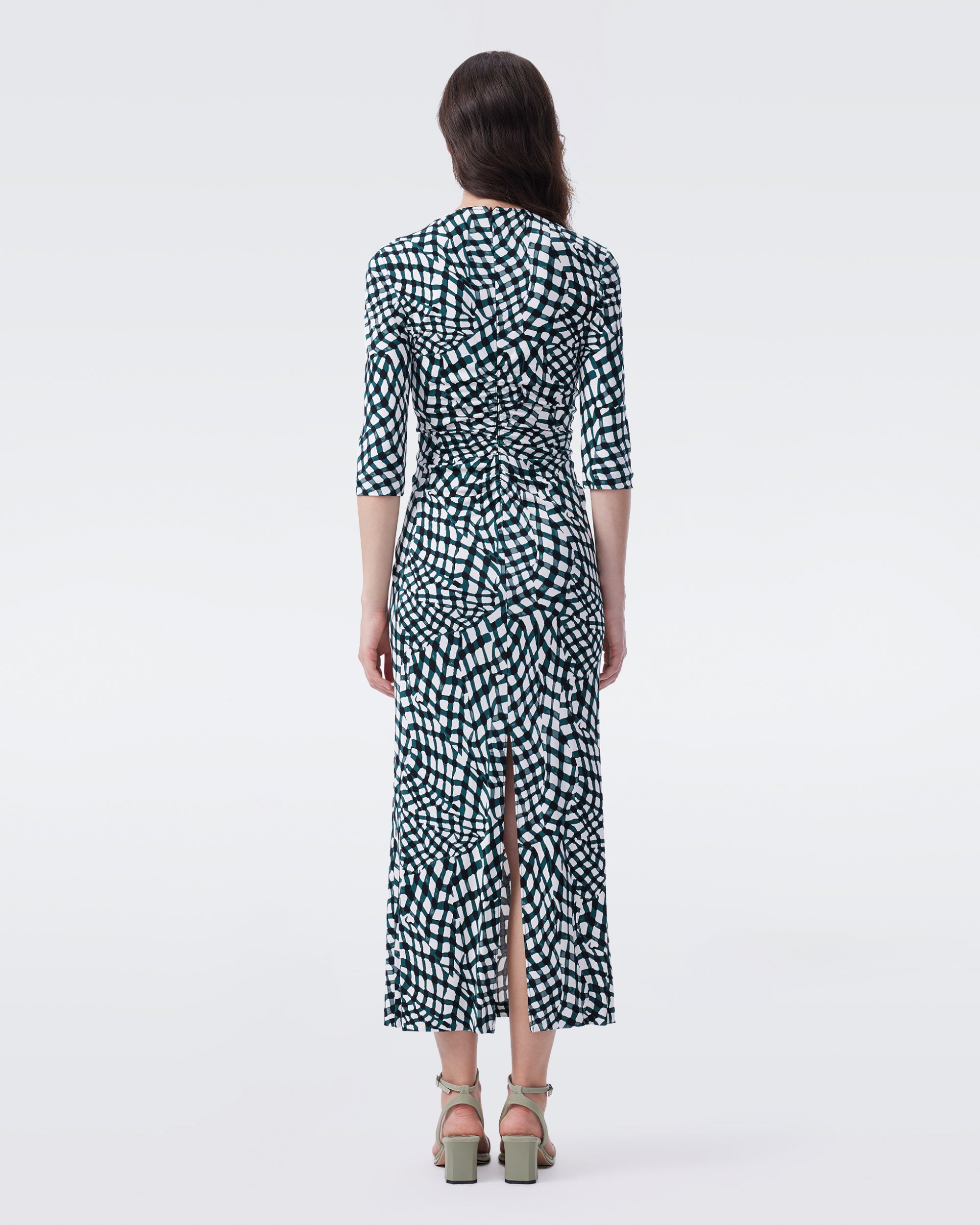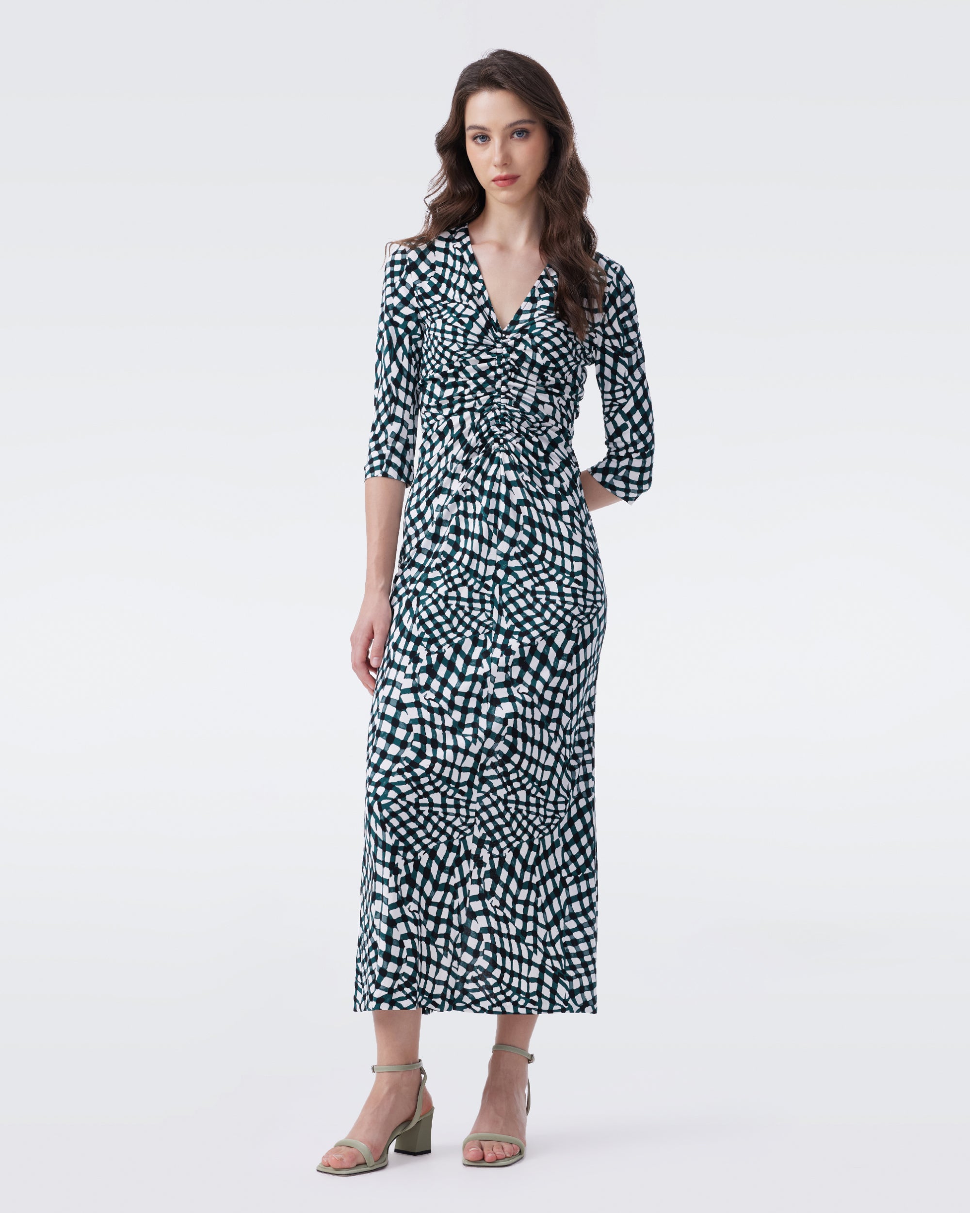 This new midi dress is elegant and slim-fit, with a V-neck that subtly elongates the neck line and three-quarter sleeves fitting the arm curve. Made of matte jersey fabric, it is soft, skin-friendly and has good drape, ensuring comfort while naturally showing smooth silhouette lines.