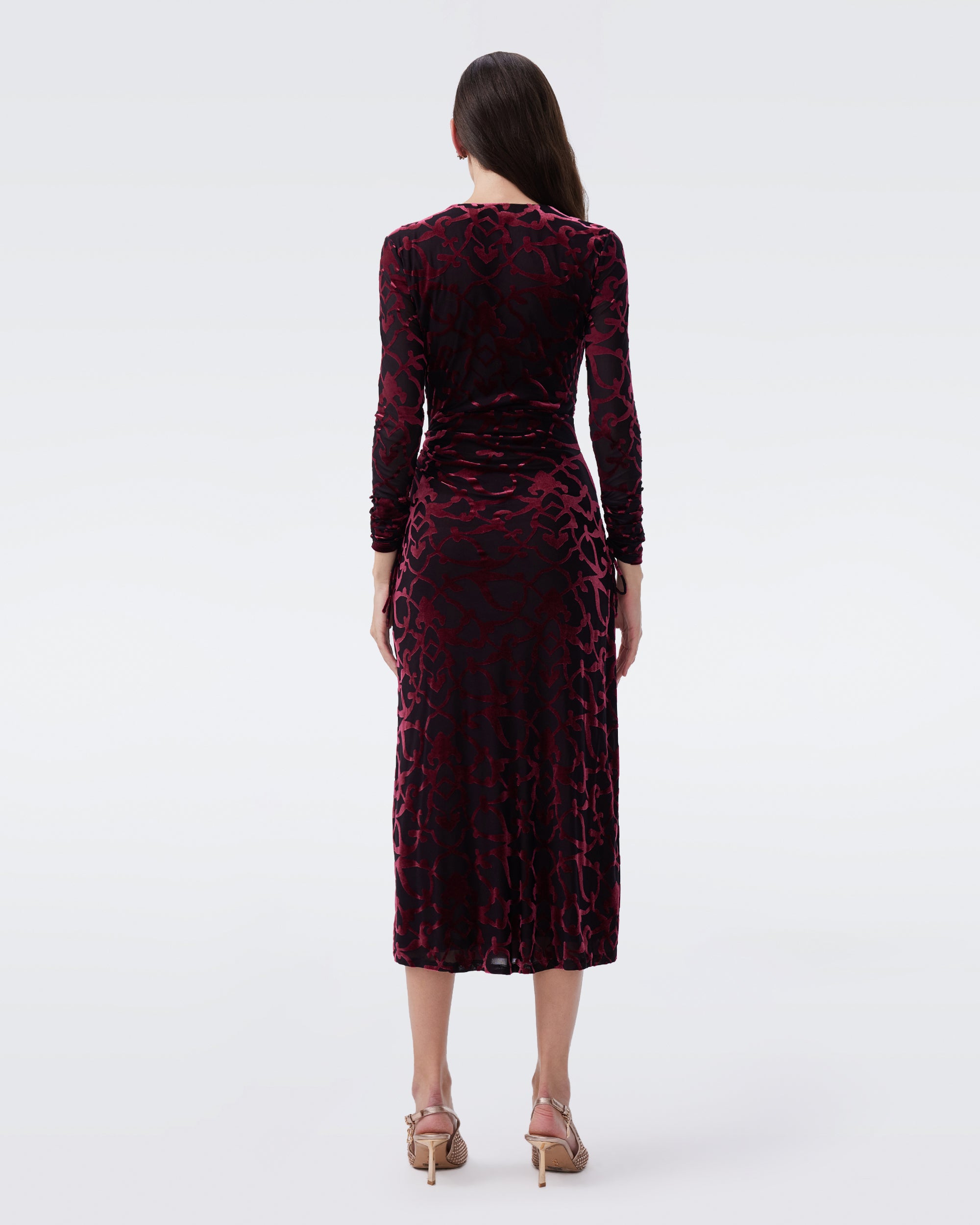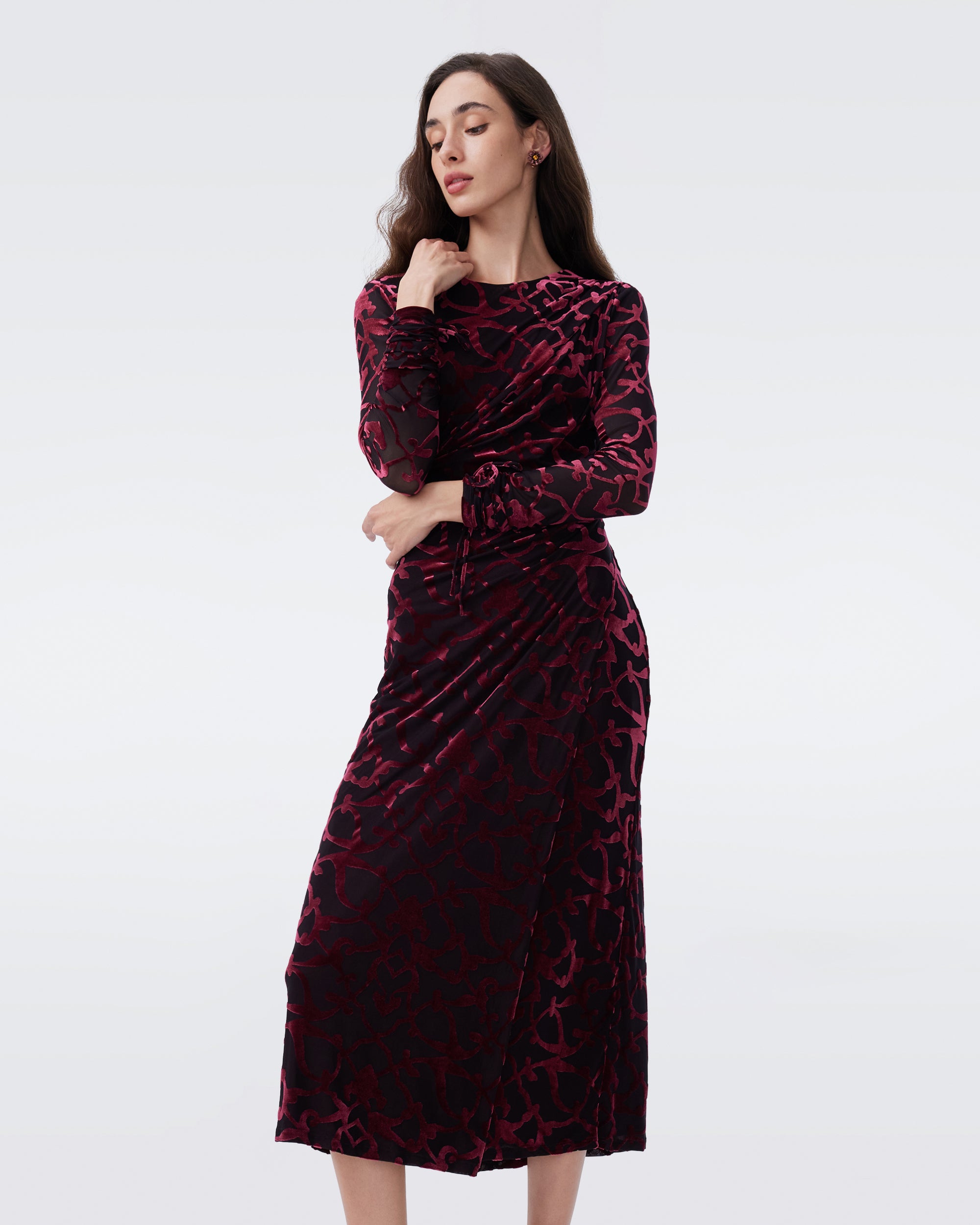 This dress not only showcases the graceful curves of the figure but also adds an elegant charm through the drape of its skirt. Crafted from mesh velvet burnout fabric, it boasts a soft and smooth texture with a natural warm luster and exceptional drape. Beyond being comfortable against the skin, it exudes a premium quality when worn.