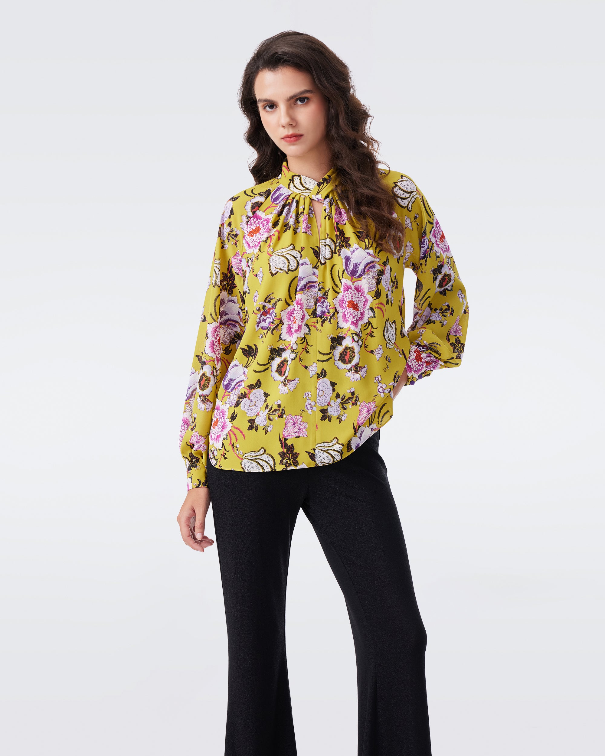 Relaxed fit top, comfy, stand collar with tie, retro lantern sleeves for romantic chic style. RECYCLE POLY TWILL, structured, drapey, comfy, easy-care. WILLOW FLOWERS print: fresh, vivid, spring-like.