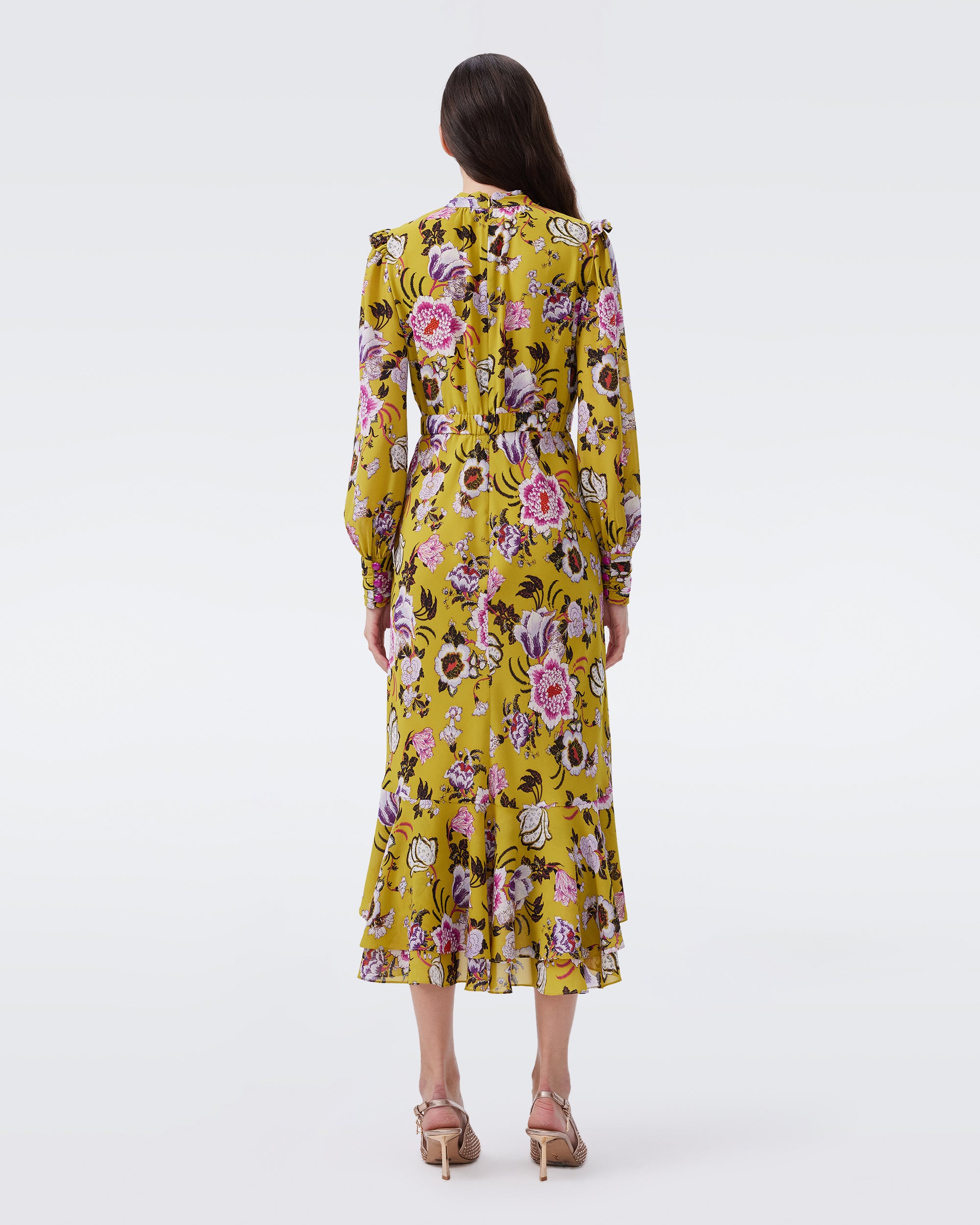 This fitted midi dress has a V-neck to flatter the neck. Lace trim at the neck adds visual detail. The asymmetrical hem feels lively and unique when walking.The fabric is light, smooth and drapes well. Bright yellow base covered with pink-purple and white floral prints—like a spring garden, retro and eye-catching.