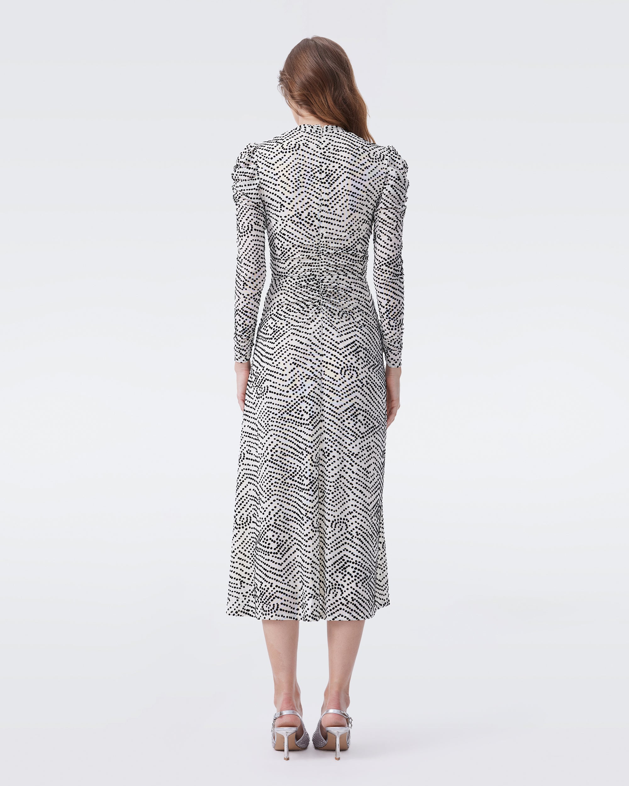 This fitted midi dress shows curves well. V-neck flatters the neck, adding elegance. Long puffed sleeves are retro, cute and layered. Side pleats and uneven hem make it eye-catching.Flocked stretch mesh: light, see-through, stretchy.