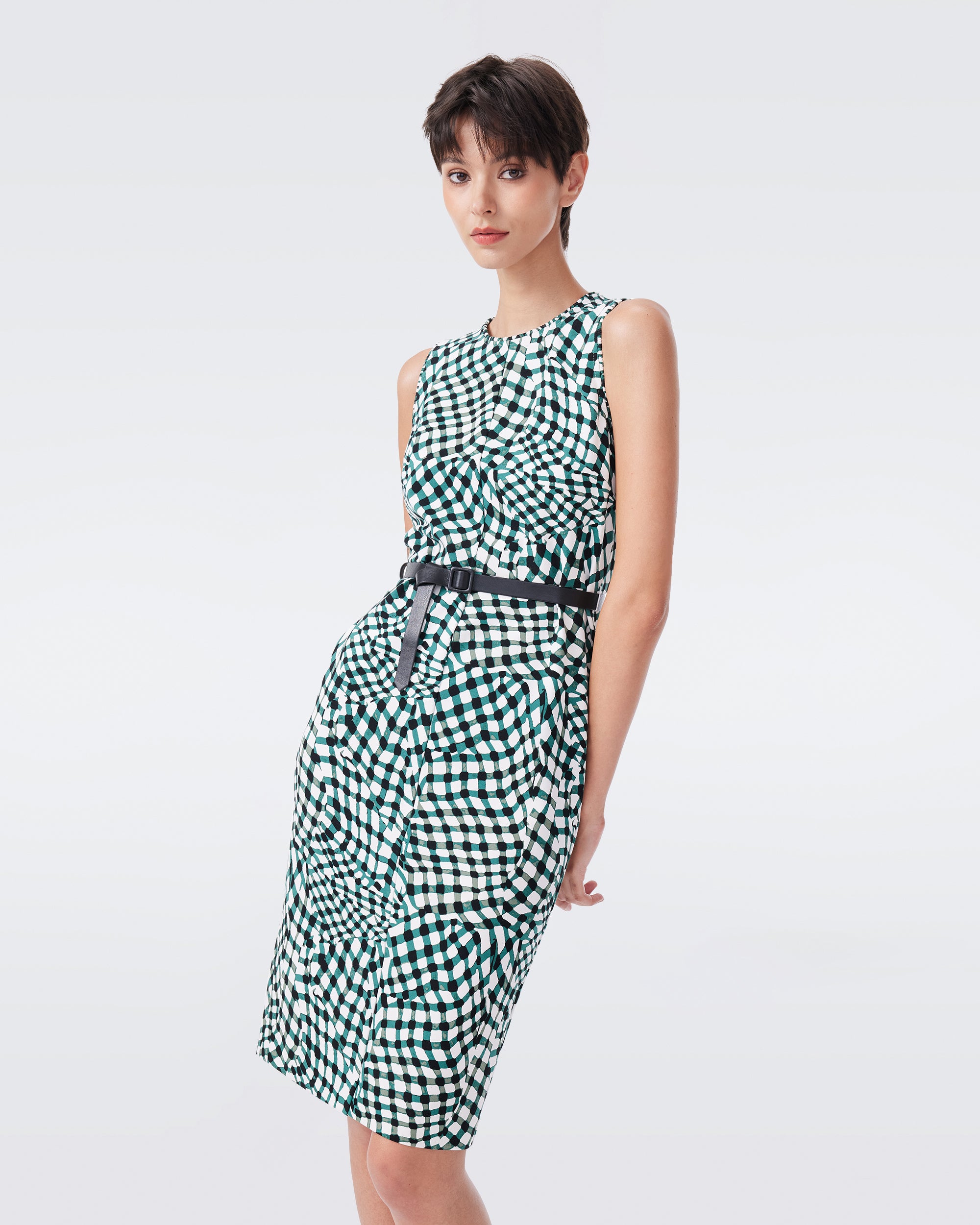 Sleeveless fitted dress,black belt defines waist. Mid-length pencil skirt fits body, suits work/formal occasions. Smooth drapey fabric,skin-friendly.Green-white geometric plaid, retro-modern look.