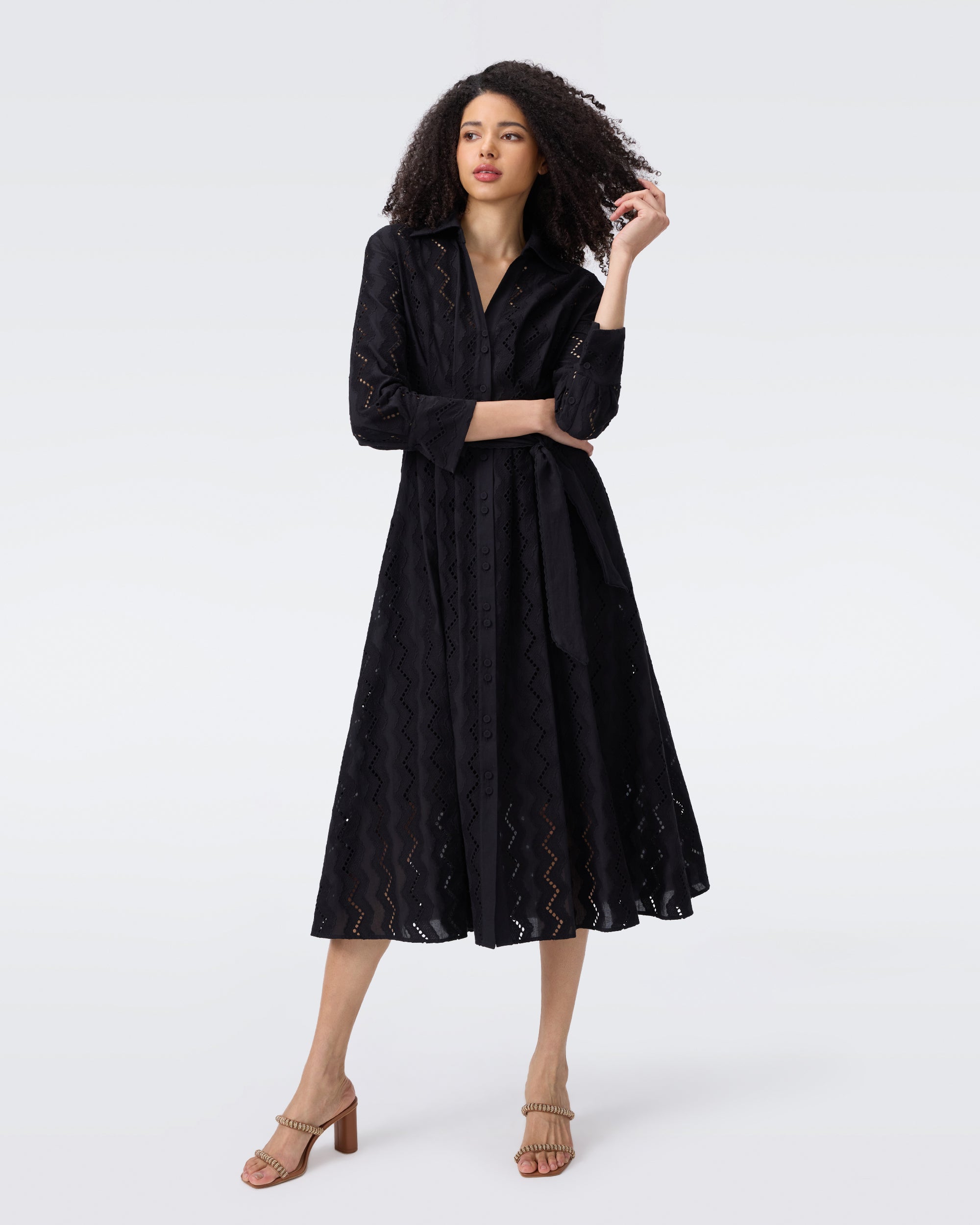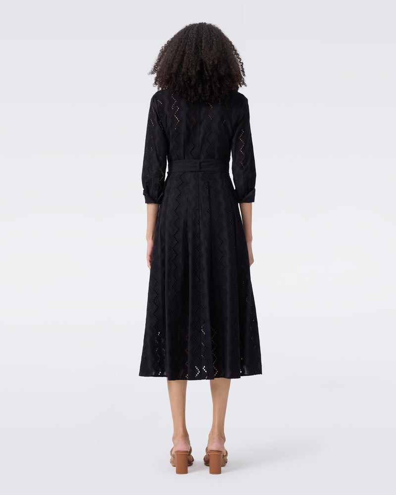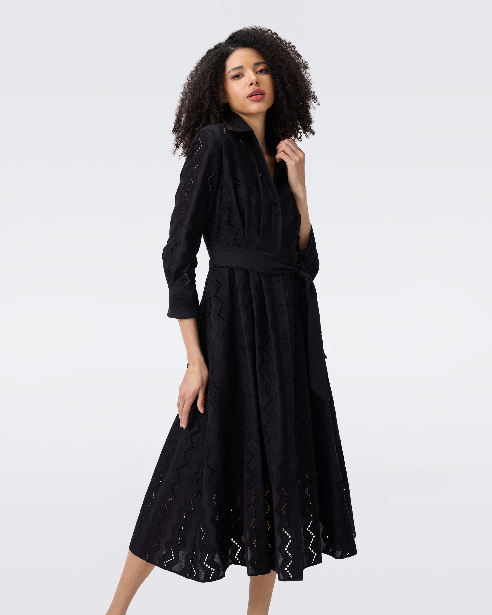 Modern shirt dress with geometric embroidery and cotton fabric. Button-down front, midi flare. Classic for office events or parties.