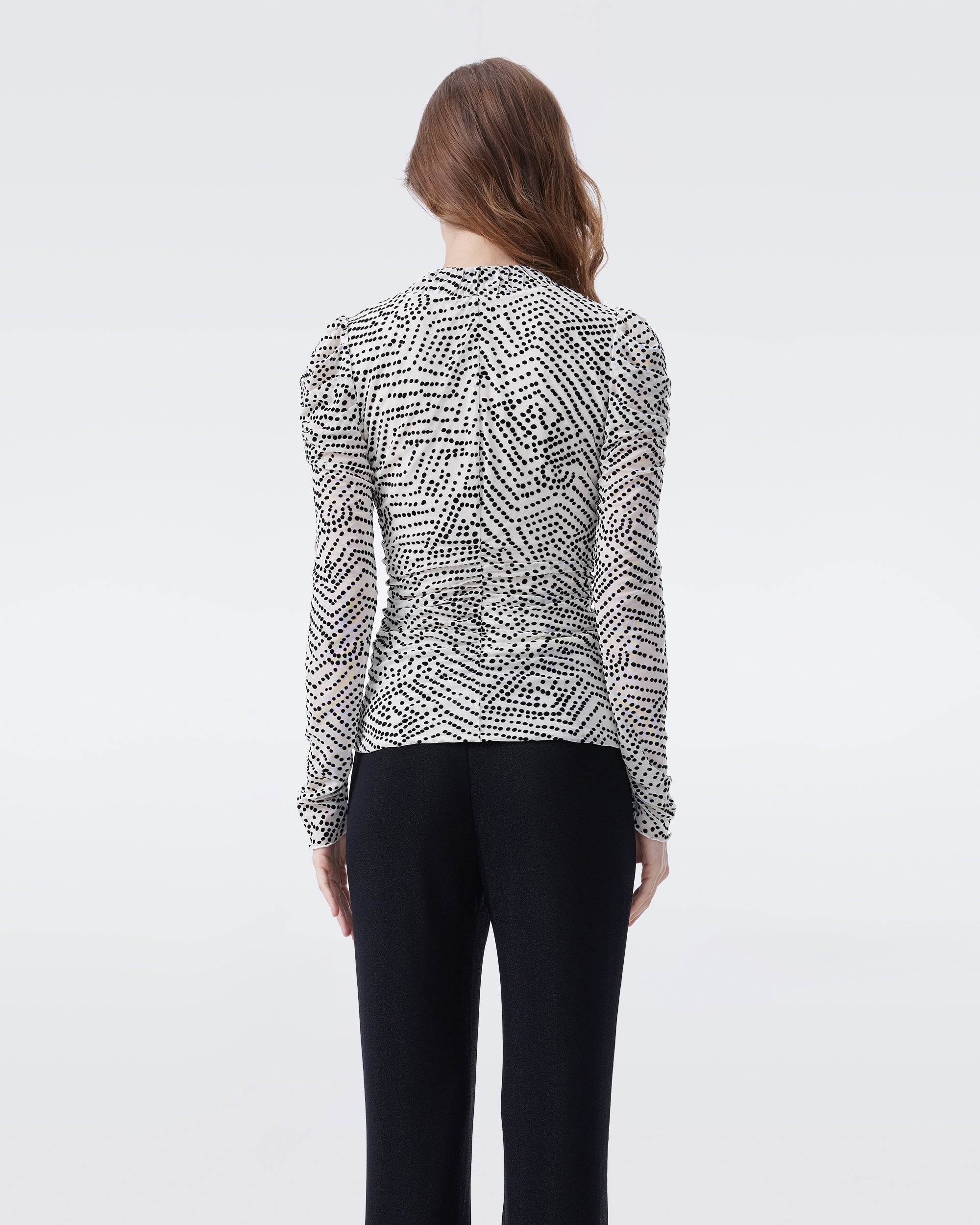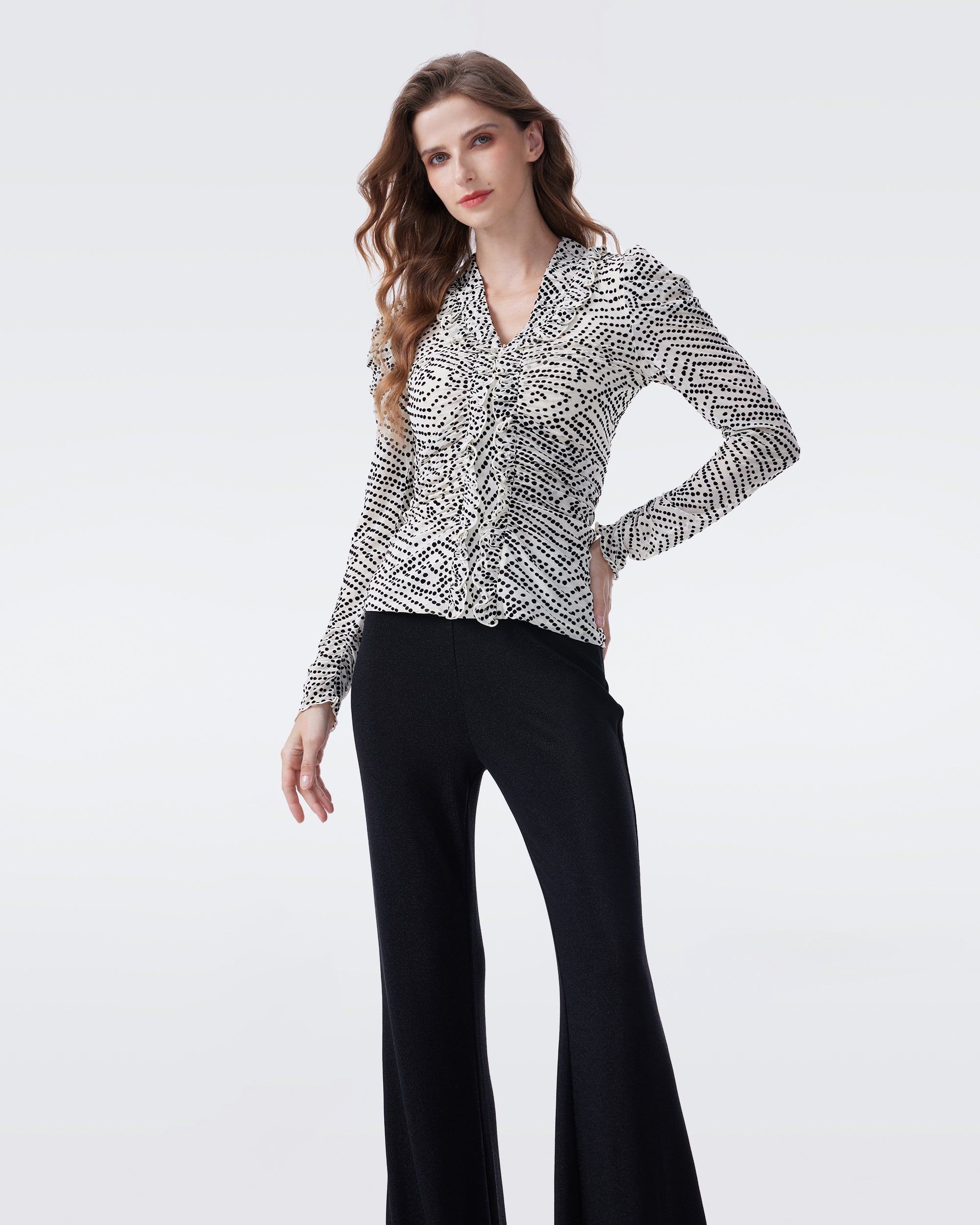 Fitted top hugs body for curves; V-neck flatters neck,puff sleeves add layers, ruffled/curved details boost charm for sweet eye-catching style. Soft stretch flocked mesh fits well.Ivory white wavy polka dot print, exquisite and delicate,making the top elegant in simplicity and a striking highlight in outfits.