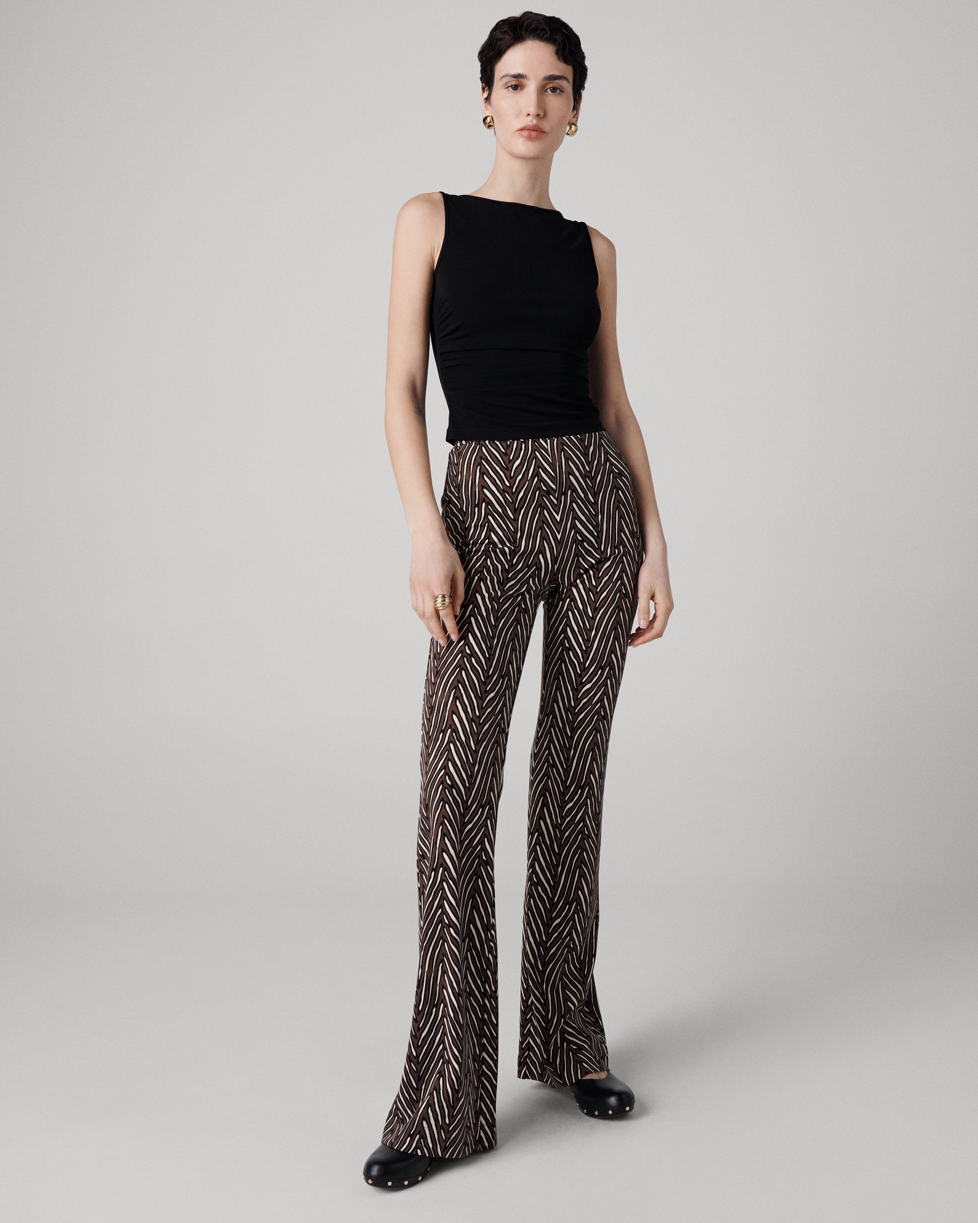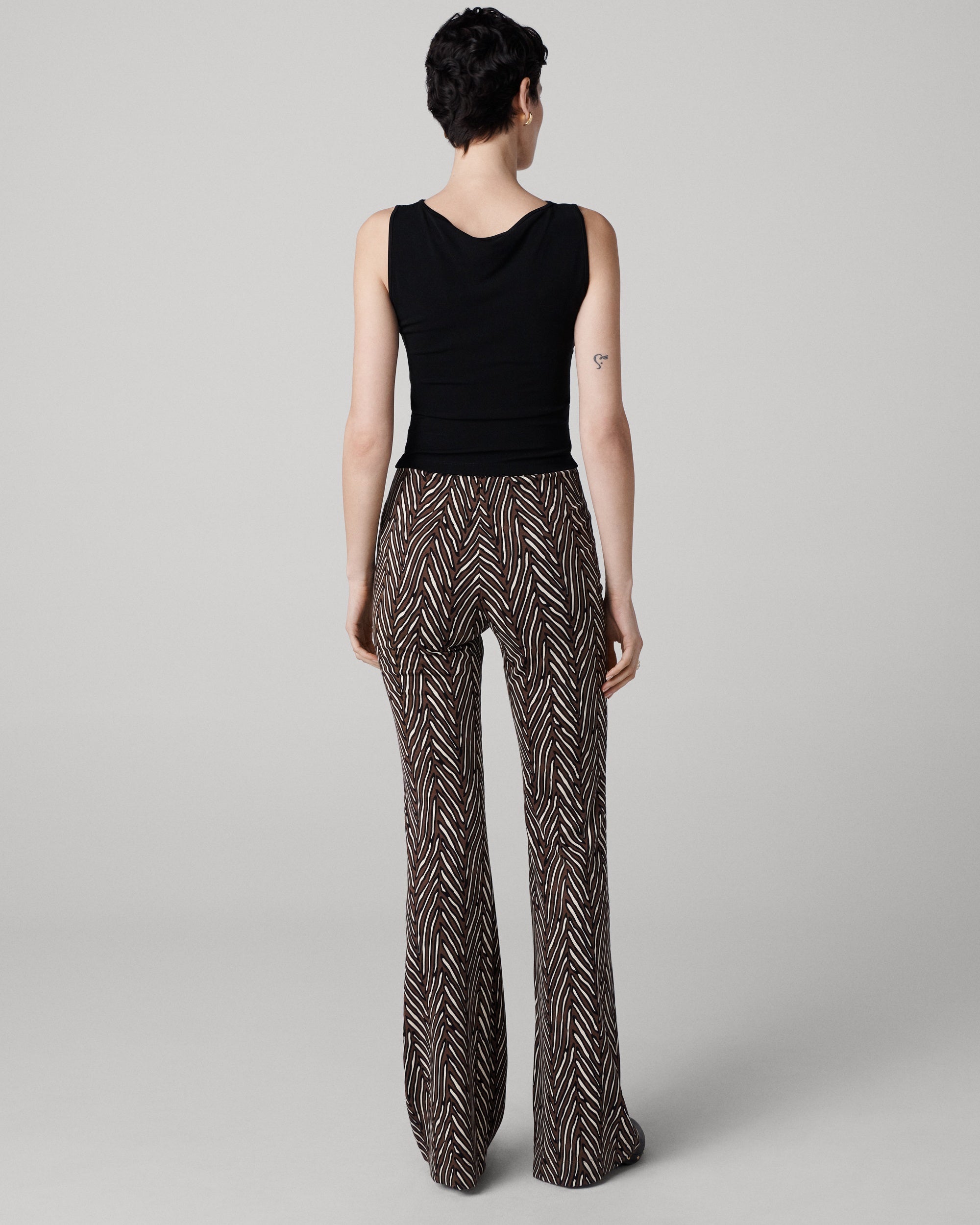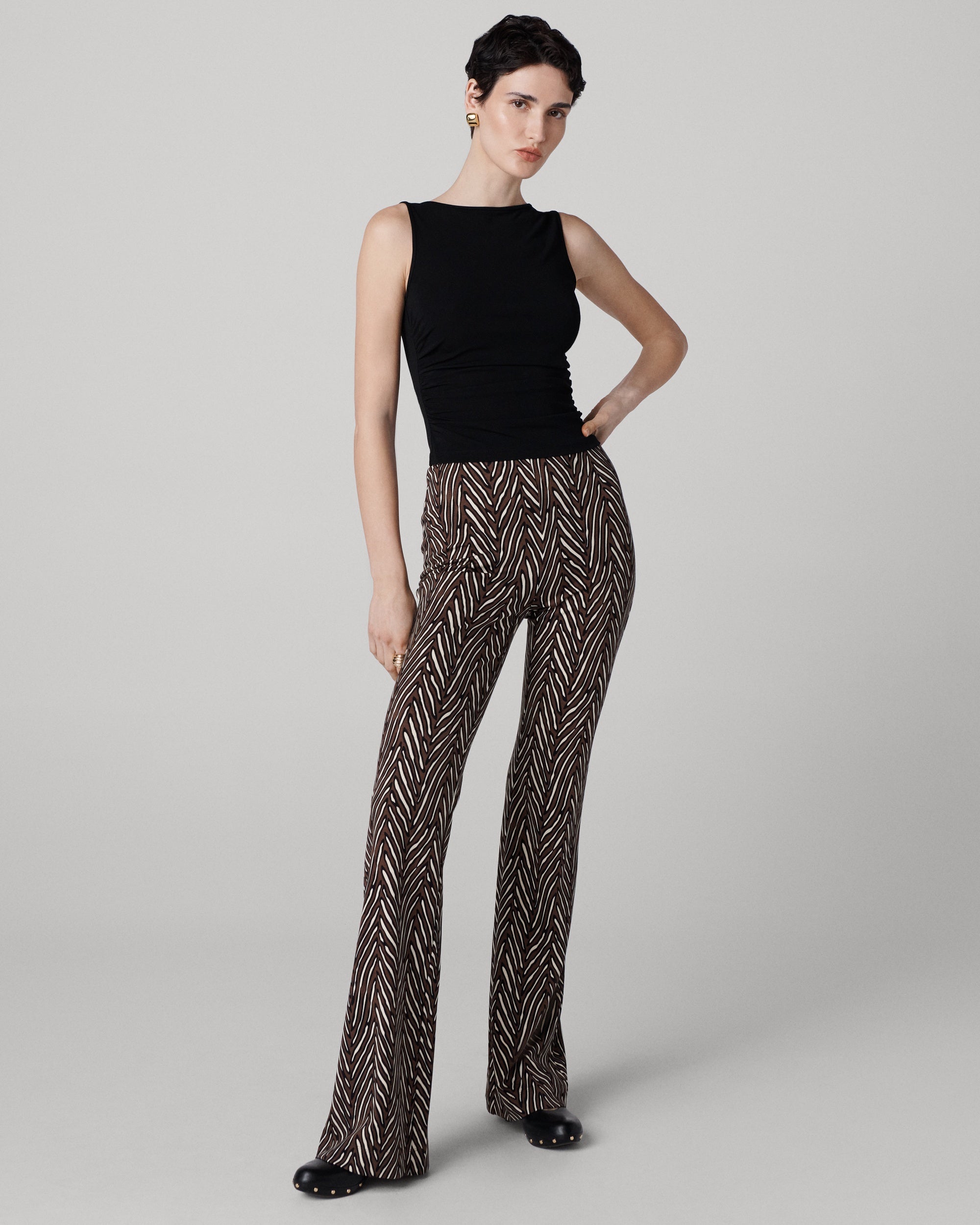 High-waisted flared design elongates legs. PIAZZA TIGER MINI PETROL pattern with eco-friendly breathable fabric. Pair with solid tops or suits for a chic look.