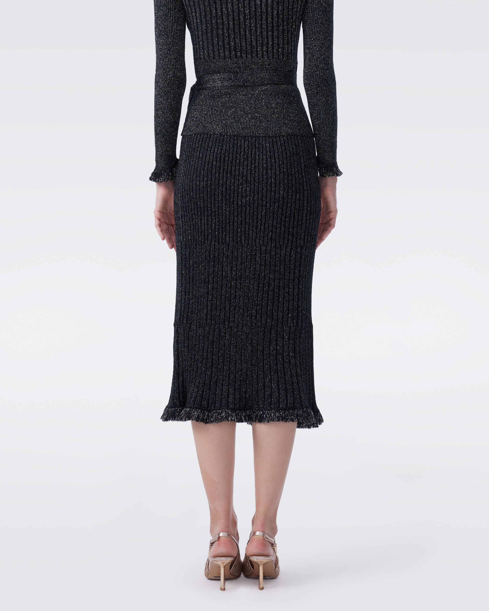 This midi skirt has unique pleats for rich texture. Side frills add delicacy; high waist makes legs look longer.Soft, stretchy ribbed knit is skin-friendly, warm and breathable, with silver shine. Silver ribs boost style and make it stand out.