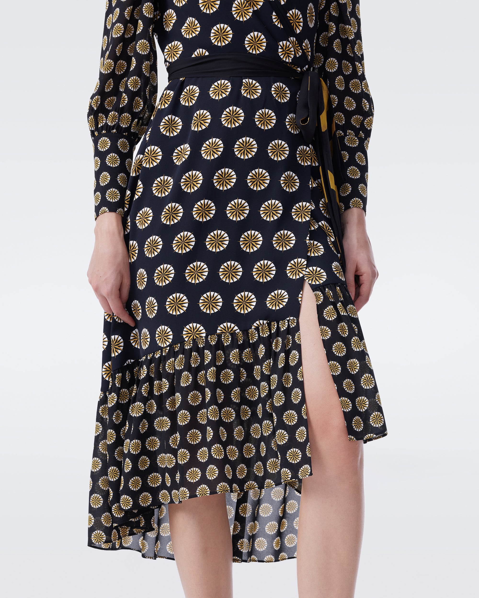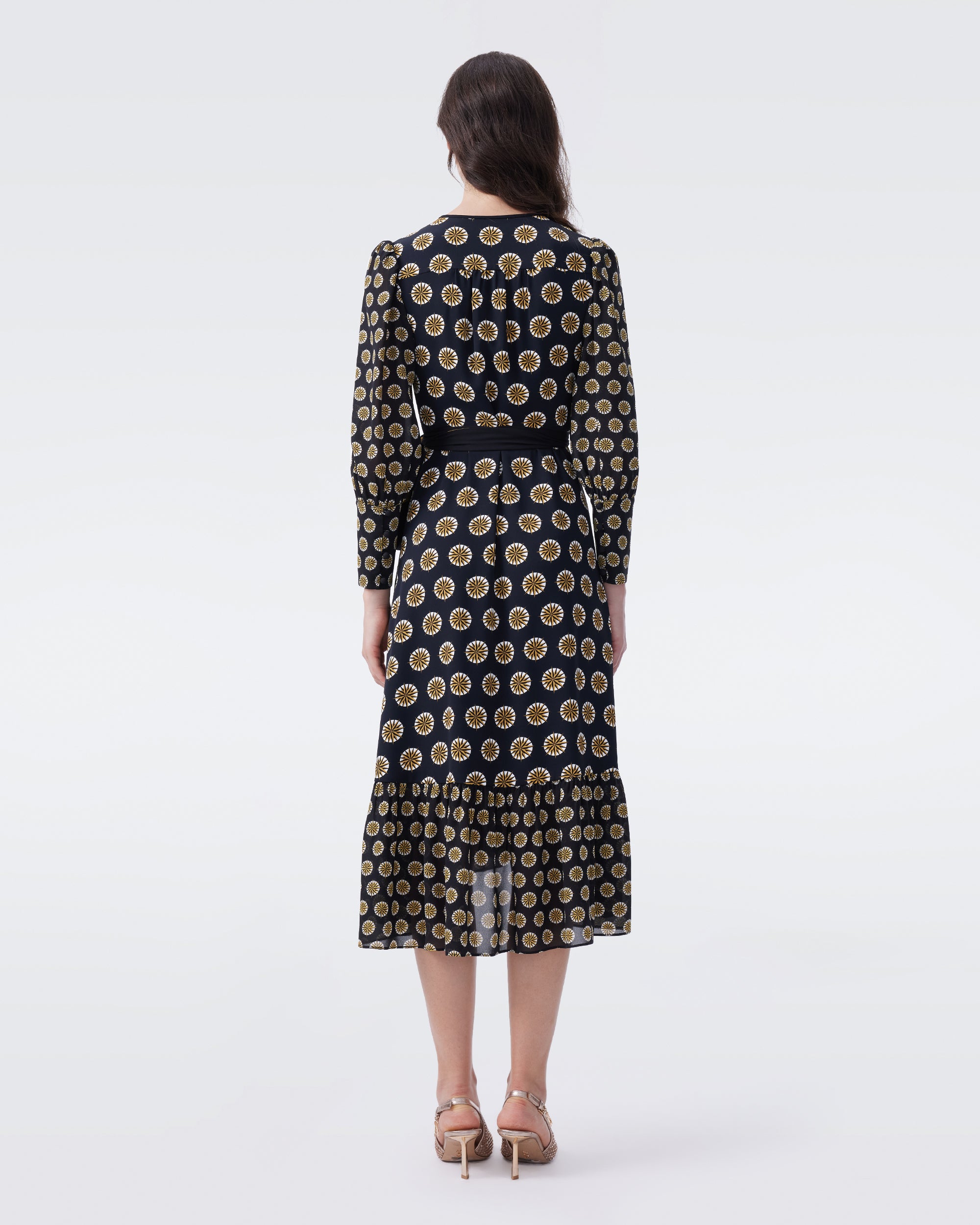 Wrap midi dress with elegant V-neck, sleeves with puff details. Waist belt defines waist; split hem adds vitality. Romantic, stylish. RECYCLE POLY TWILL, draped, body-hugging, wrinkle-resistant. Gold compass rose print, luxe, mystical, unique.