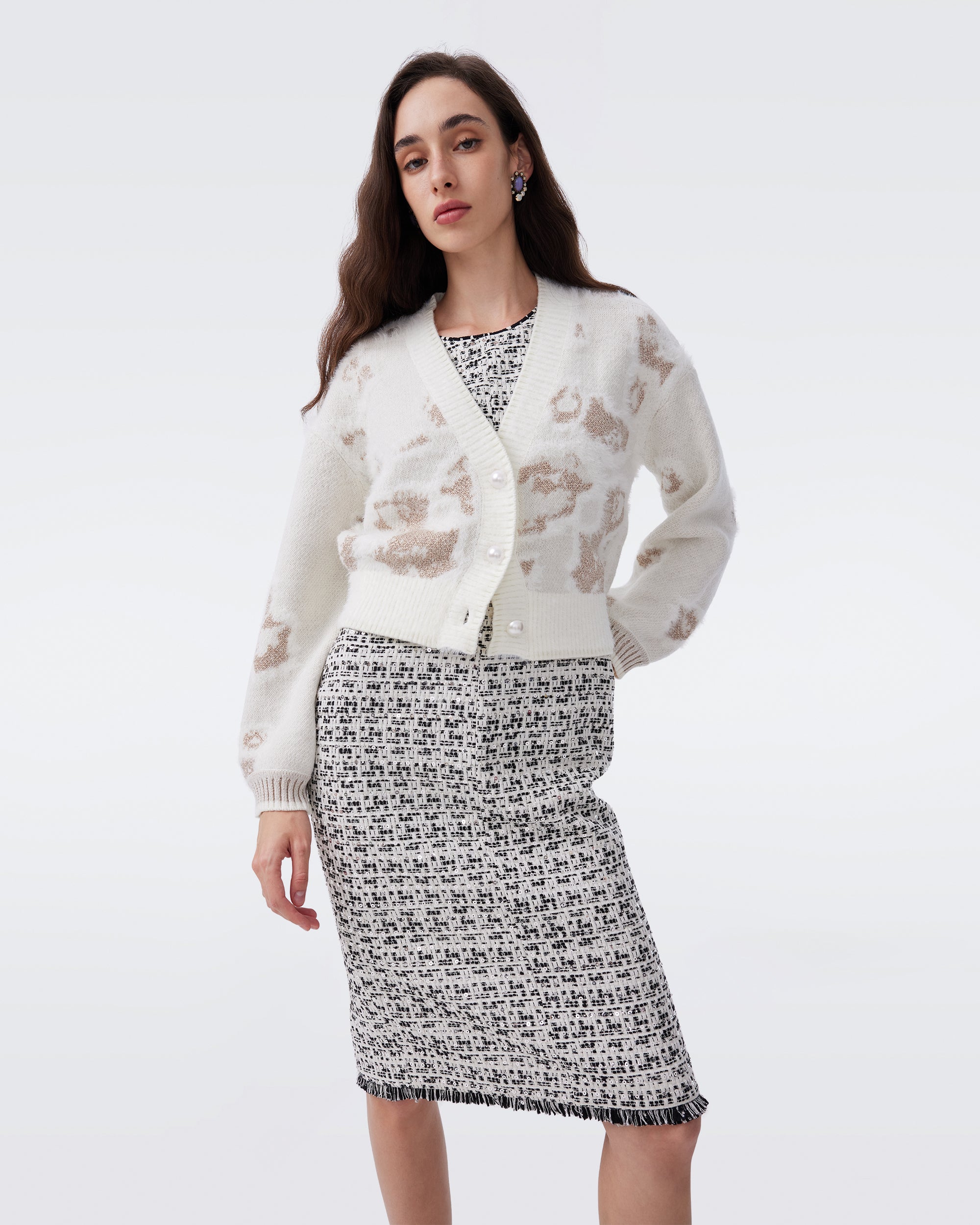 This loose, short cardigan fits all body types and feels comfortable. V-neck adds elegance,  frayed edges bring delicacy and romance. Gold buttons add retro style, boosting texture and recognition. It has an elegant, refined look for a unique outfit.