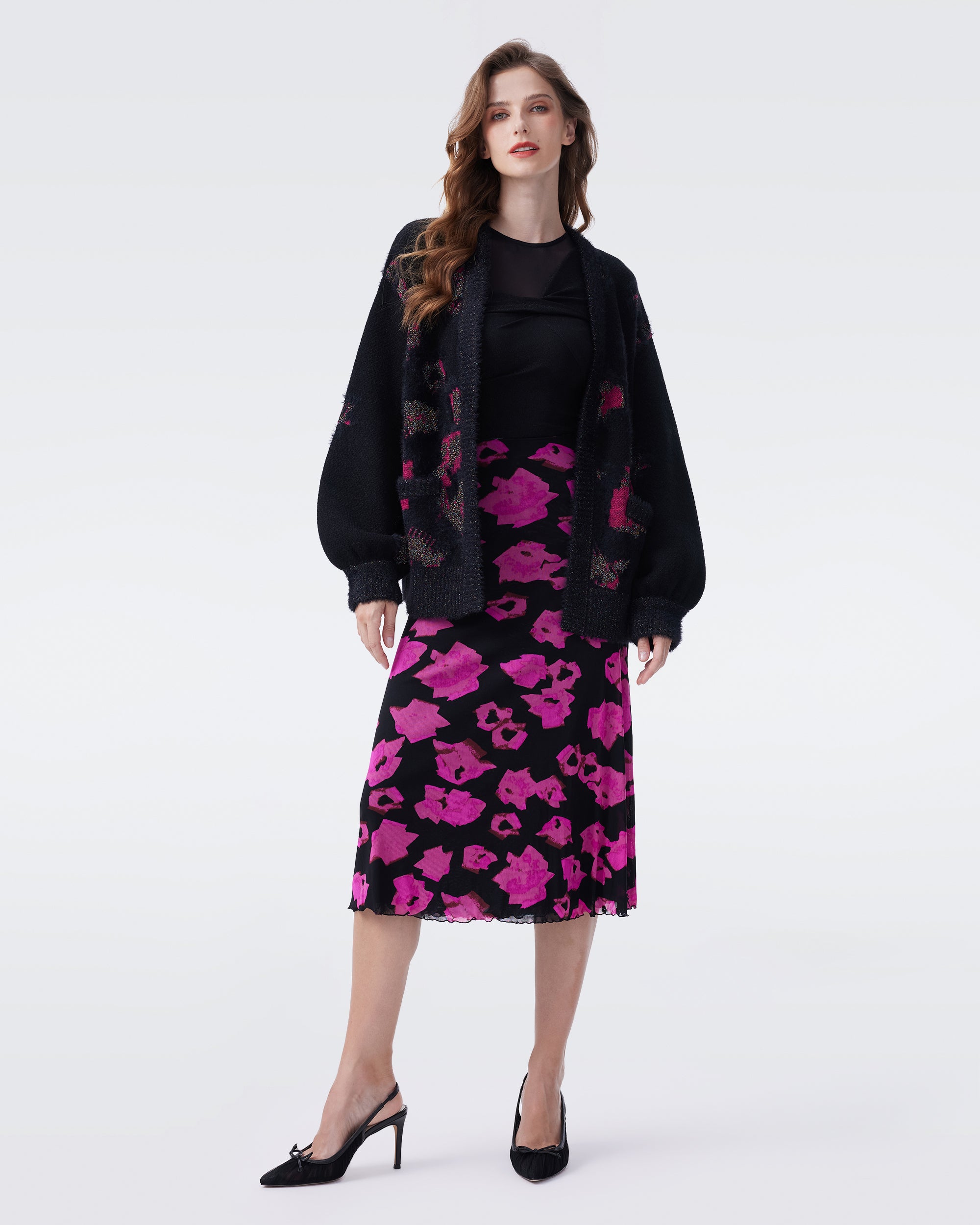 This loose cardigan is comfortable to wear. Classic V-neck adds elegance; fuzzy texture with print makes it a stylish outfit highlight. Soft knit jacquard,black base with charming purple rose patterns. Bold color contrast brings strong visual appeal.