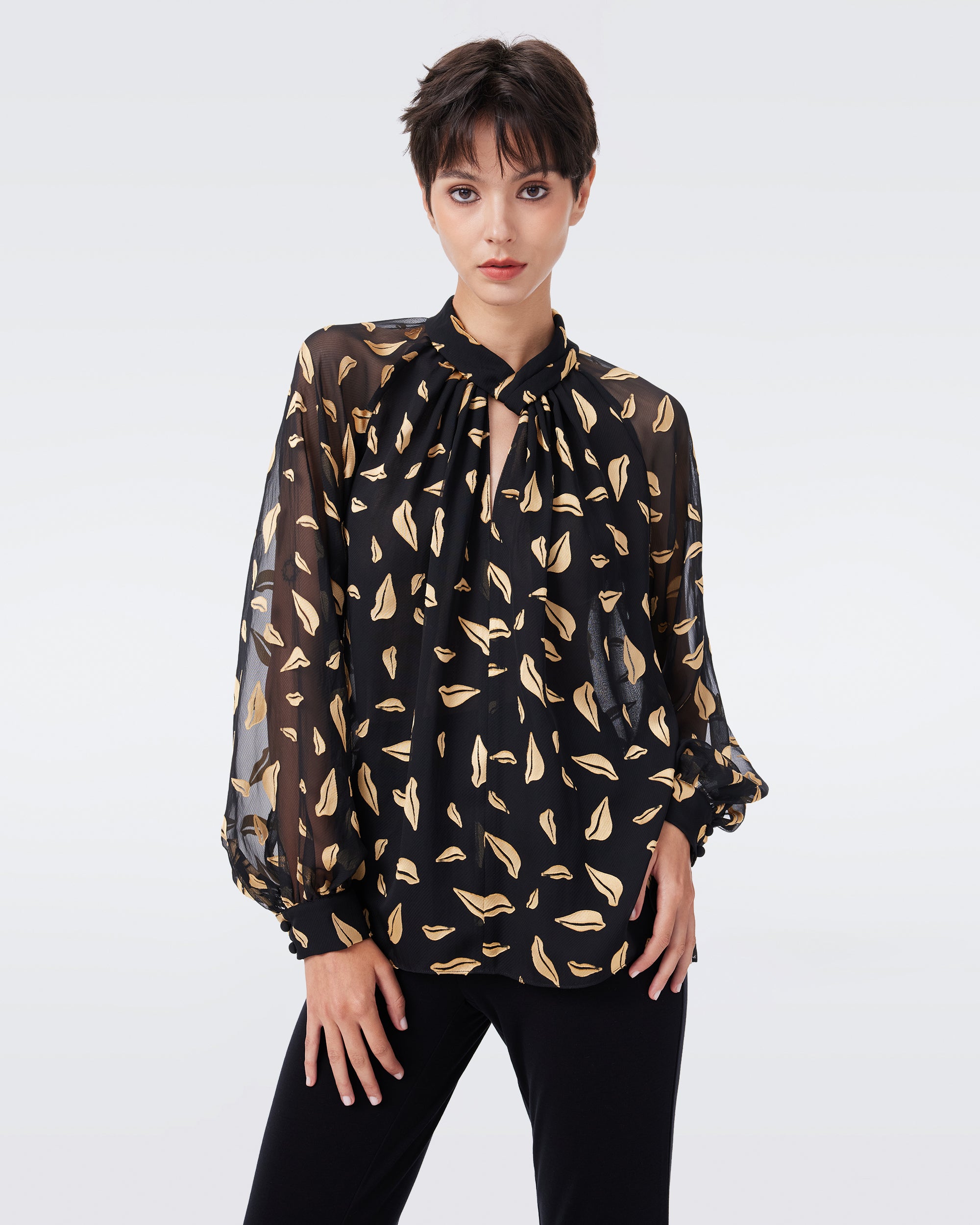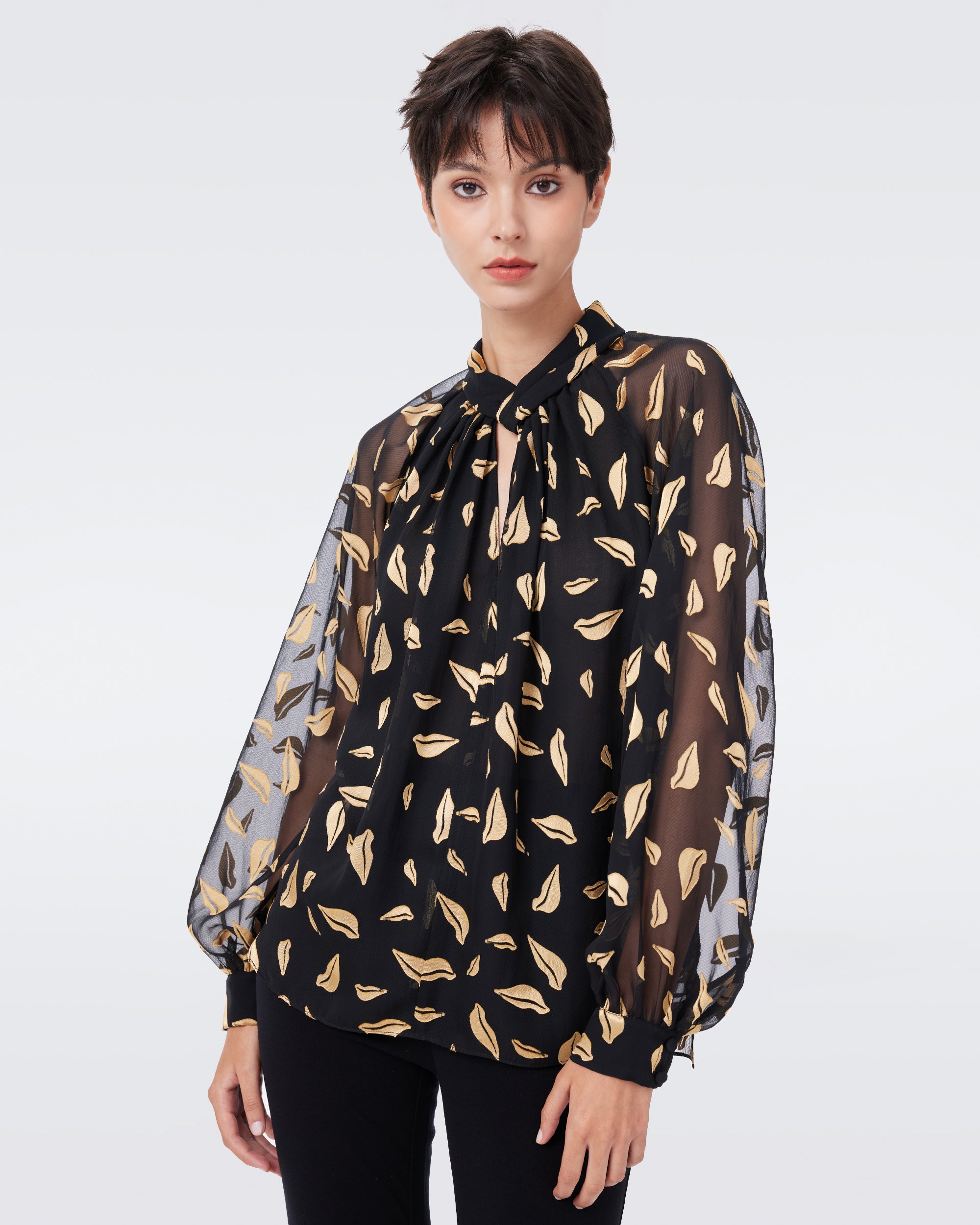 Relaxed top, comfy,stand collar with tie,retro lantern sleeves for romantic chic.Burned-out chiffon, light,breathable,with dynamic drape.gold lip print, stylish, romantic, adding unique charm.