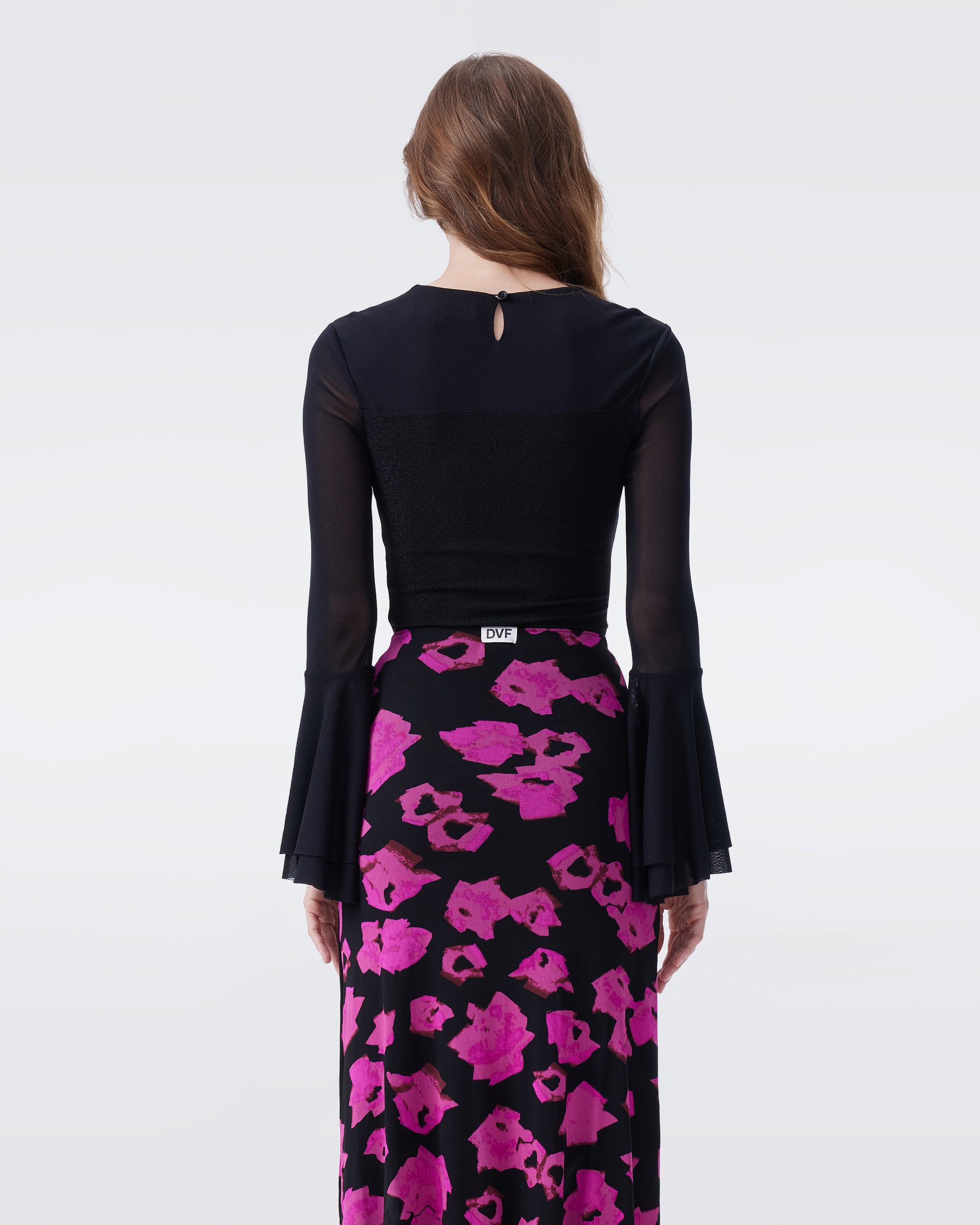 The fitted top hugs the body to highlight curves, with vintage elegant flared sleeves adding layering and chest, creating a unique eye-catching style. It’s made of stretchy mesh, light, elastic,comfy and flexible. Pure metallic black, with a deep tone and metallic texture, is simple and elegant, easy to match, creating a cool and high-end look.