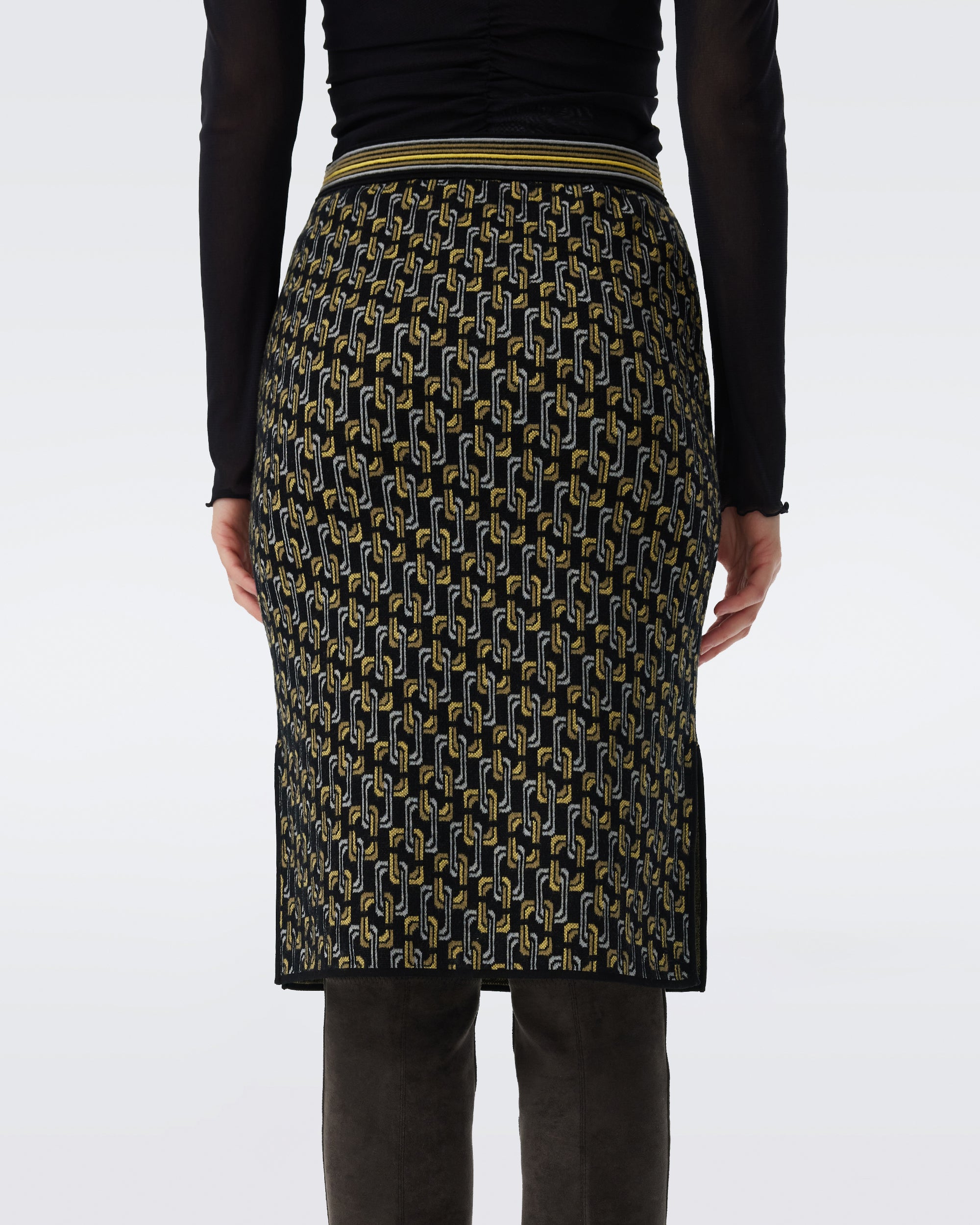 Slim-fit pencil skirt with a clean silhouette that flatters your figure. Features eye-catching geometric prints and contrast-color waistband stripes for modern look. Made from soft, stretchy jacquard knit that's breathable and structured. The black base with yellow/white colors creates a bold yet wearable statement—turning this skirt into an fashion outfit.