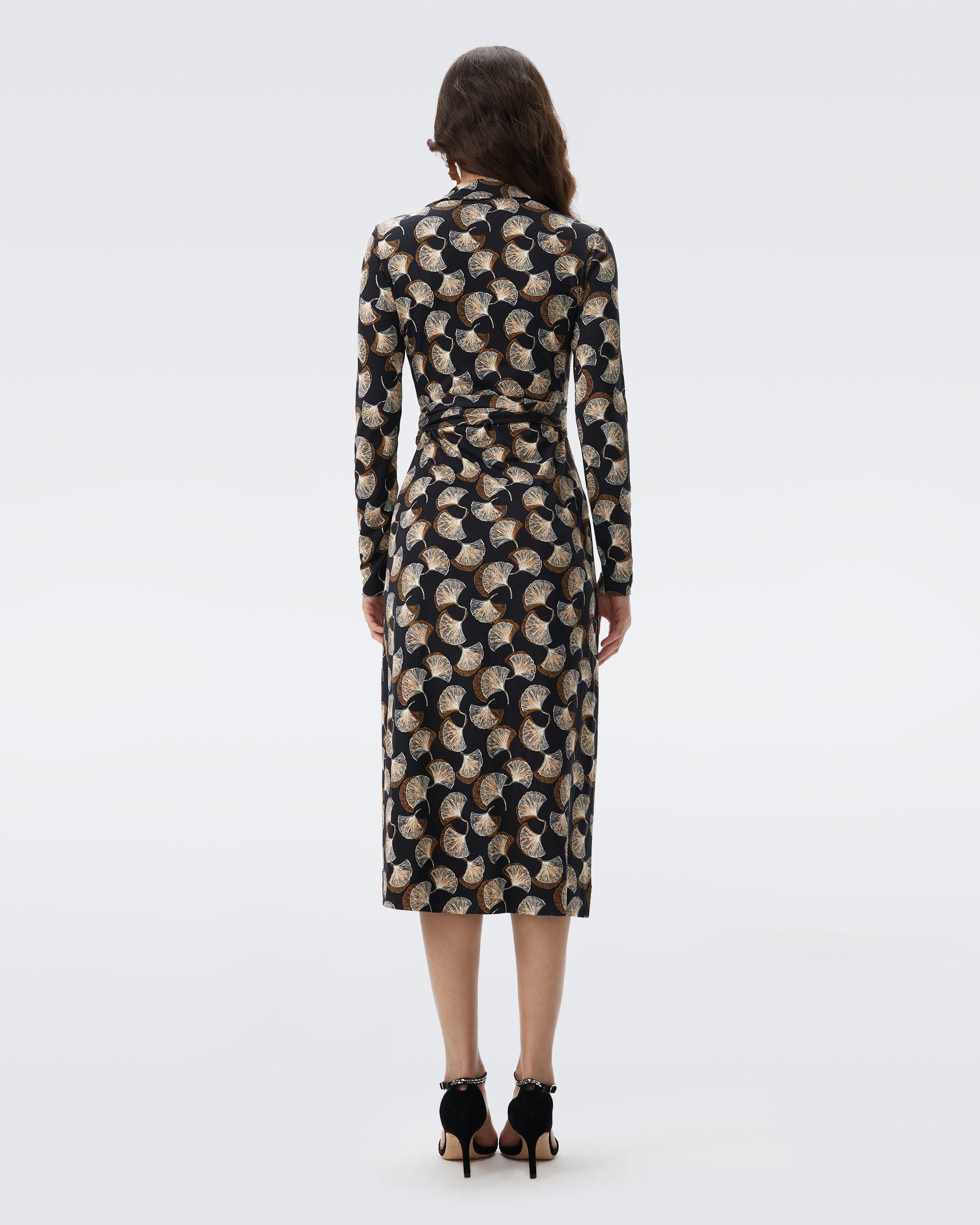 The classic wrap dress silhouette by DVF features no buttons or zippers—only a waist belt to cinch into a flawless waistline. The coffee-colored ginkgo leaf pattern exudes a warm, cozy vibe perfect for autumn and winter.