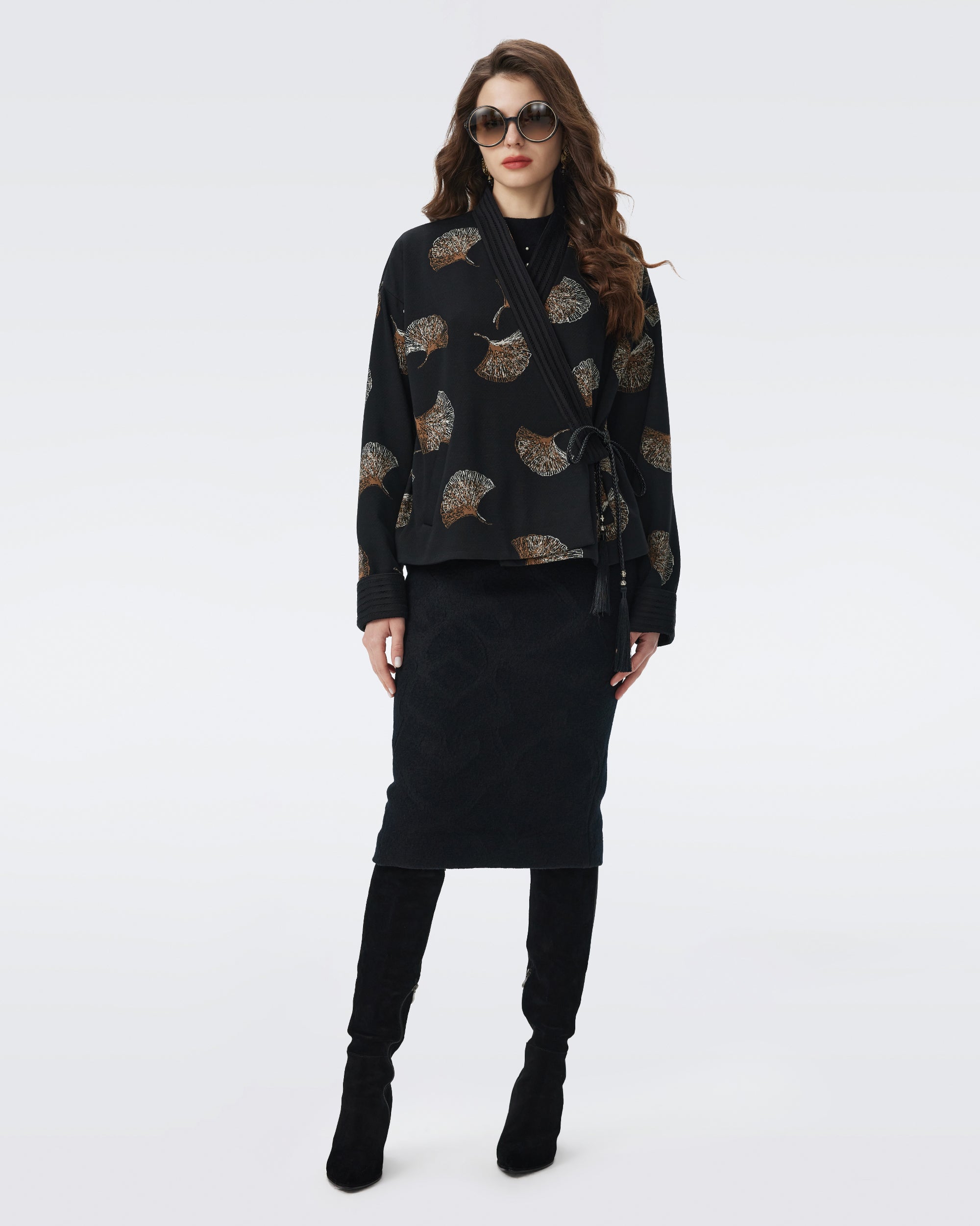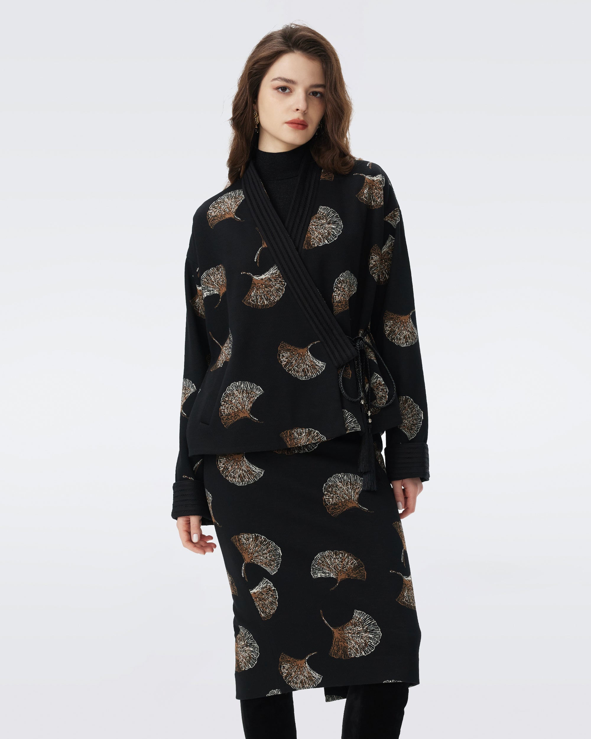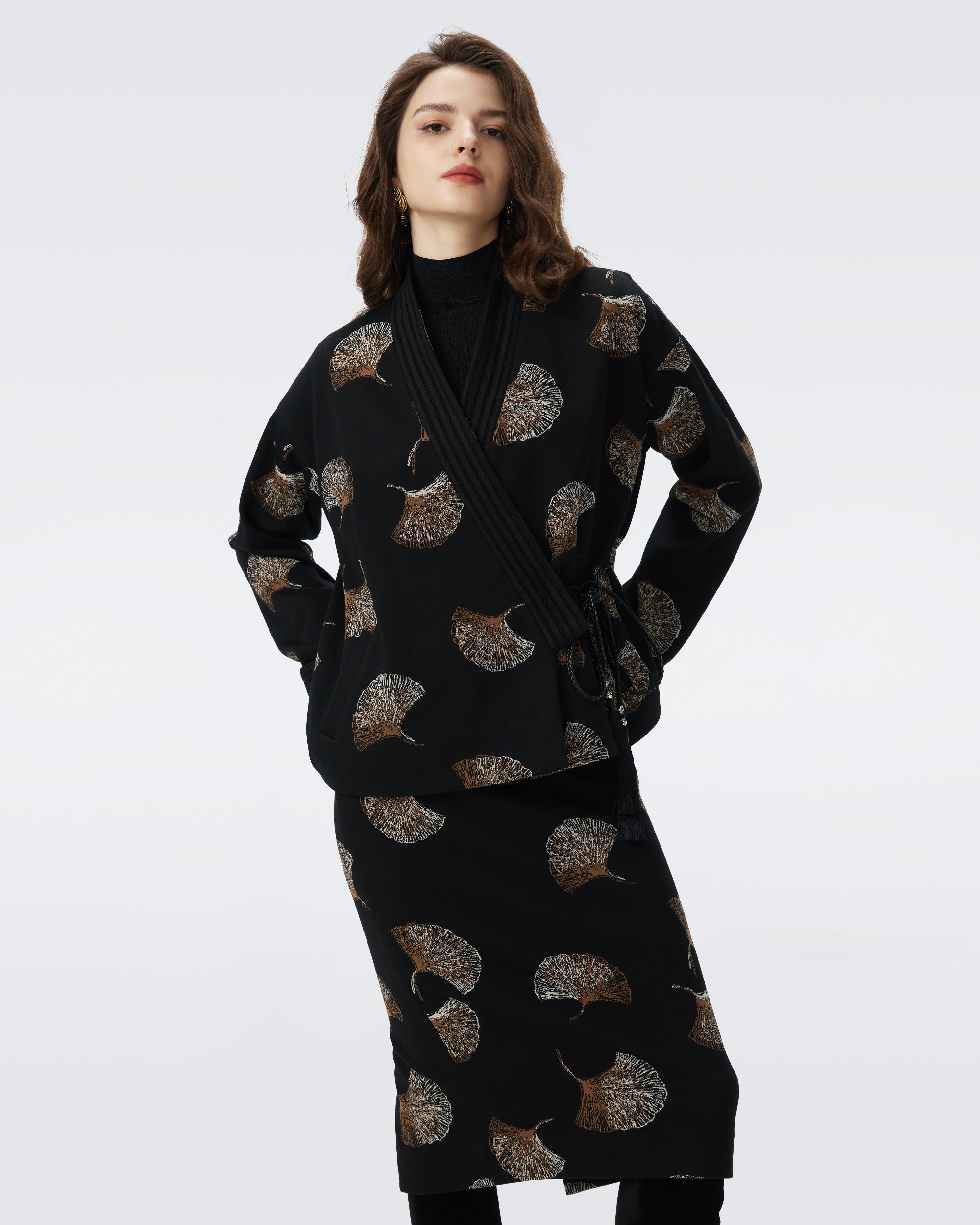 Loose cross collar top. Asymmetric placket + braided tassel ties add layers on it. Jacquard knitted fabric, soft, stretchy, comfortable, warm & breathable. Highlights prints and cuts. Creates a casual, elegant vibe. Black with gold brown ginkgo prints,Makes the top a standout.