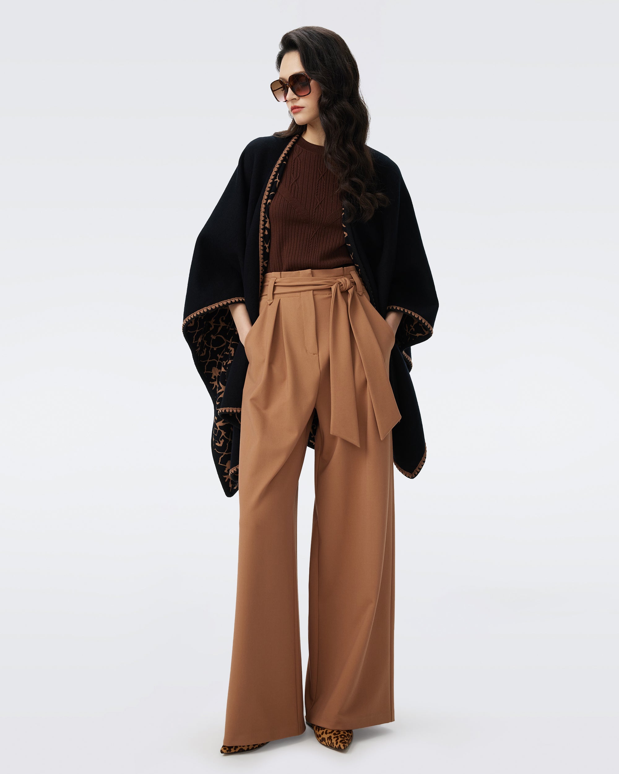 Cape style, loose and free. Reversible wear,one side black, the other brown print. Contrast piping adds layers. Unique, chic, creates a casual, trendy look. Wool blend fabric, thick, soft, warm. Double sided weaving keeps it structured.