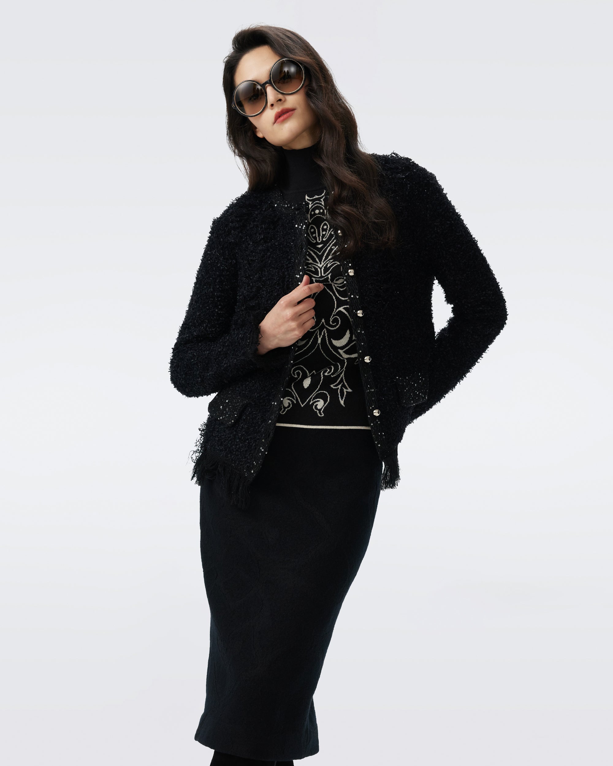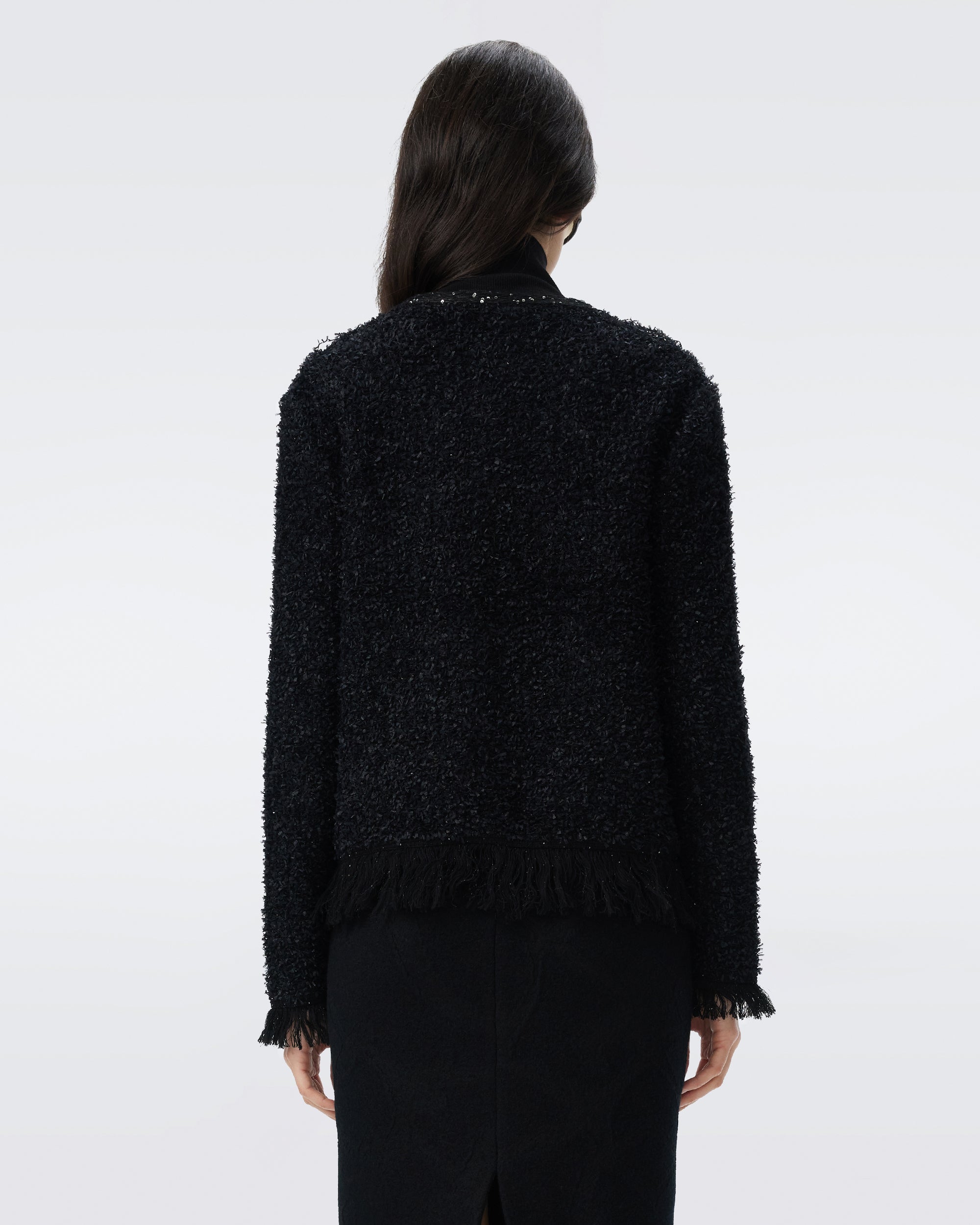 A cropped crew-neck coat with a neat and delicate cut. Woolen fabric, soft and fluffy in texture, with excellent warmth retention. The sequins and tassels are crafted with fine workmanship, not easy to fall off. They can perfectly present the design details and create a luxurious texture.
