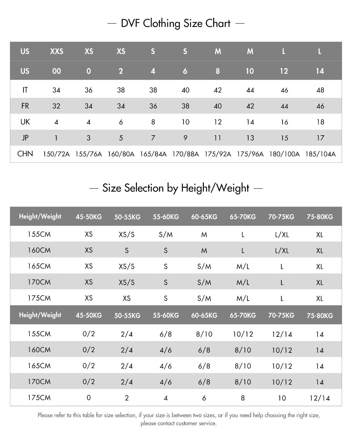Please note: All DVF garments are produced in US sizing. The size conversions for United Kingdom and Europe are suggestions. Because sizing and cut will vary between styles, please use this chart as a general guide. If you are between sizes or need assistance, please contact Client Services.