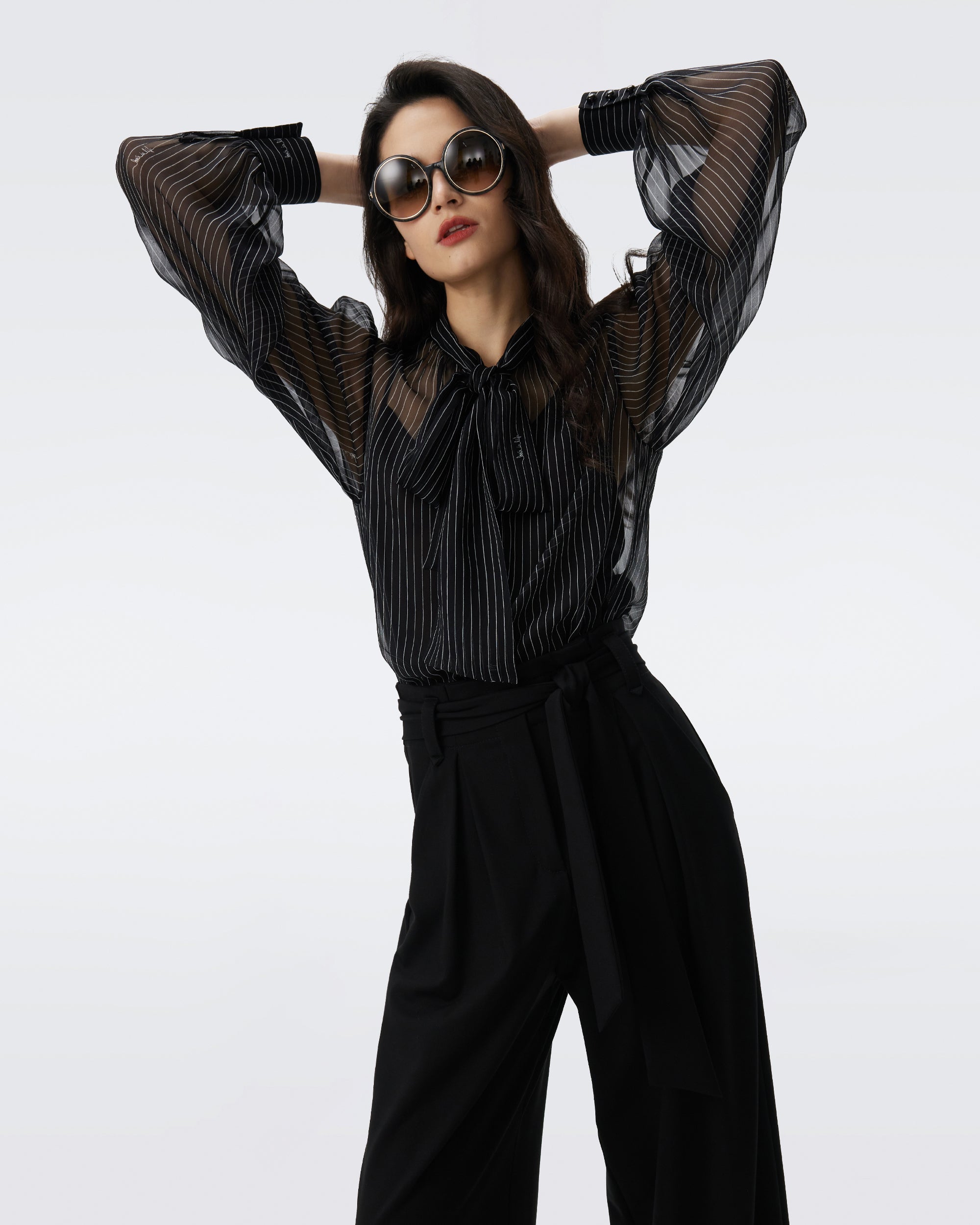 Made of lightweight, see - through chiffon fabric with delicate stripes. It's breathable, comfy, and has a hazy elegance. Black - white stripes are classic. Loose fit flatters all body types. Bow at neckline, lantern sleeves add charm. Pair with wide - leg pants for work, or leather skirt + boots for outings.