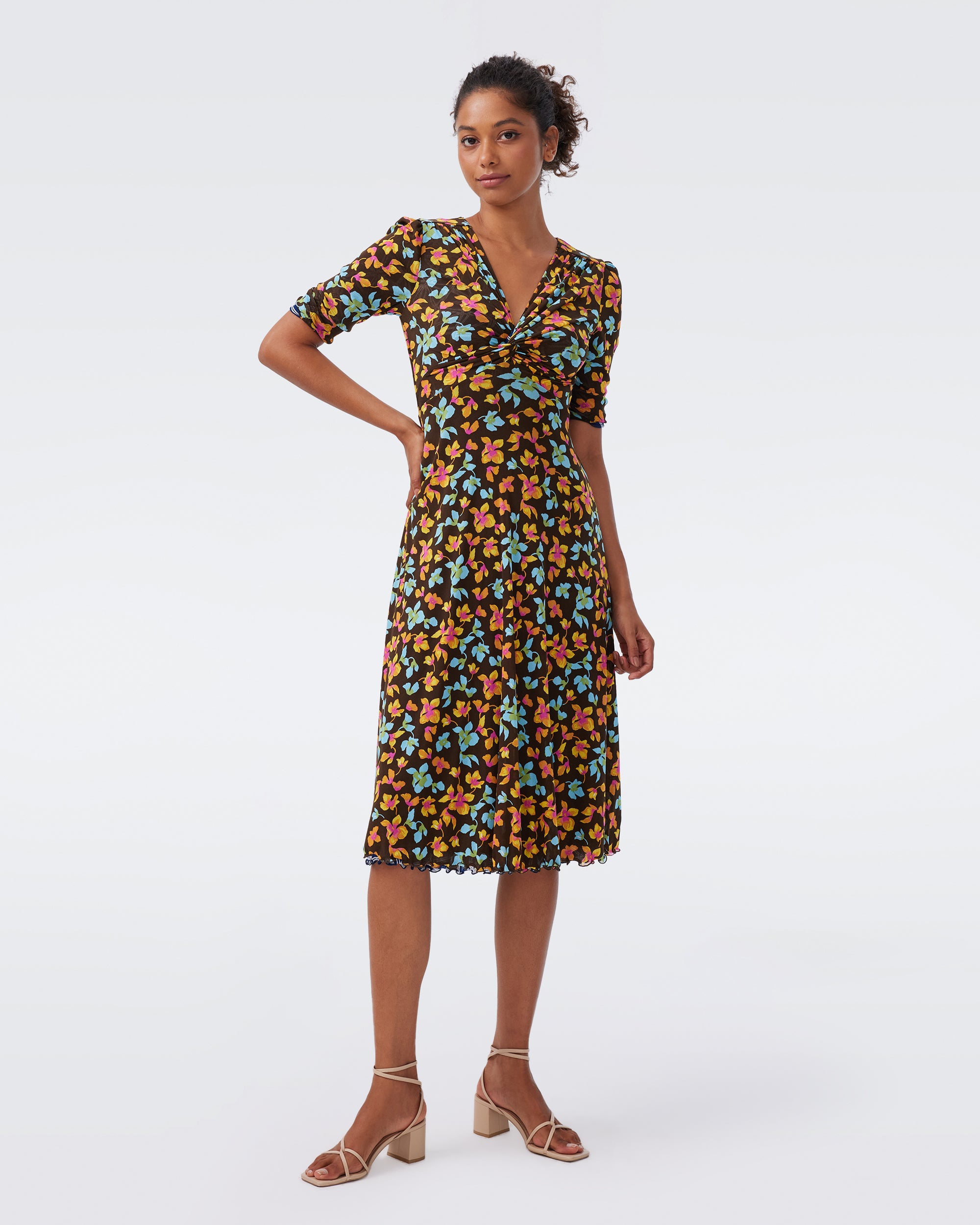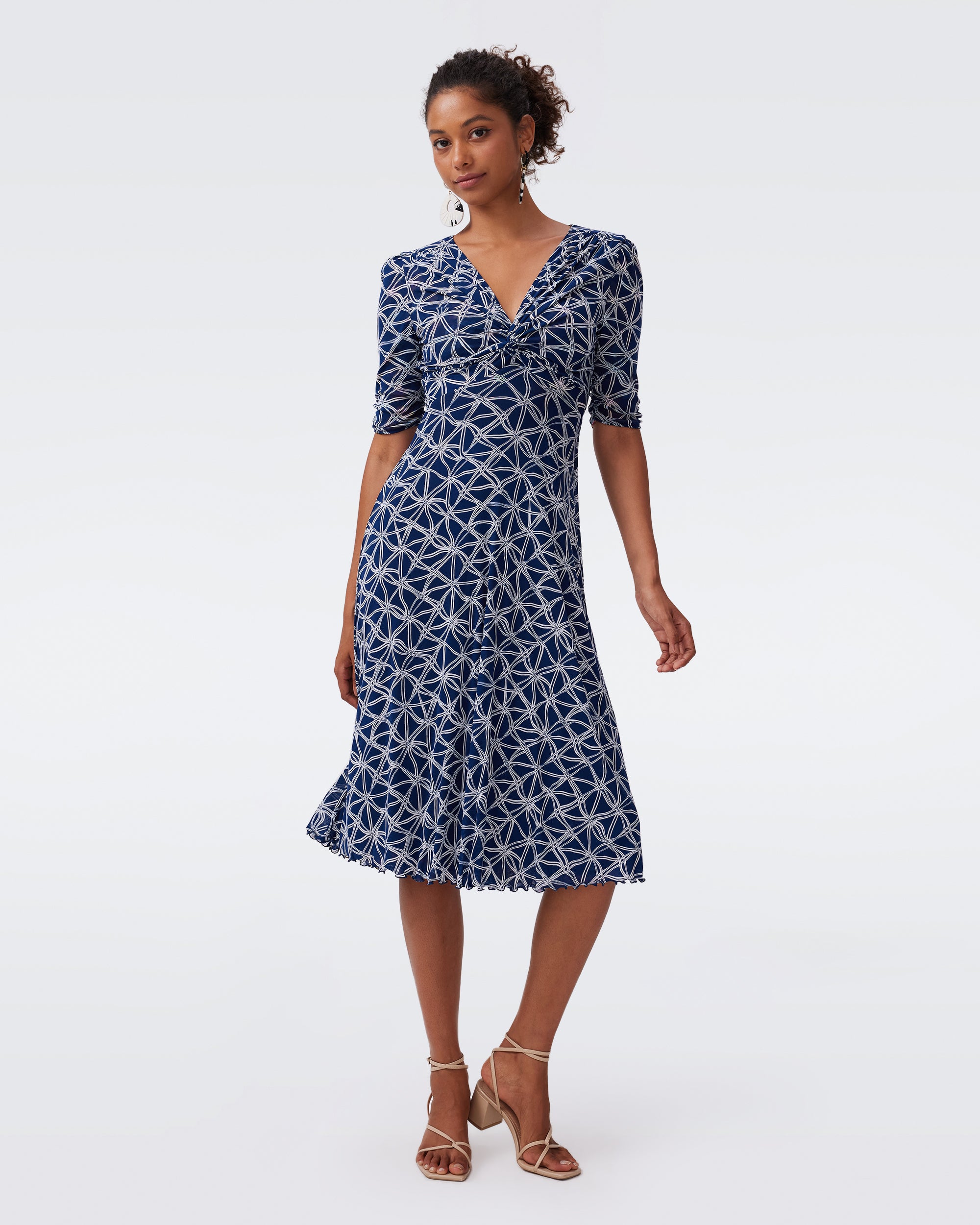V-neck with front twist detail accentuates beautiful curves; midi A-line draping hem exudes romantic and lively feminine charm. Crafted from stretch mesh fabric, it features a smooth touch and great drape, fits the body naturally and ensures comfortable wear.