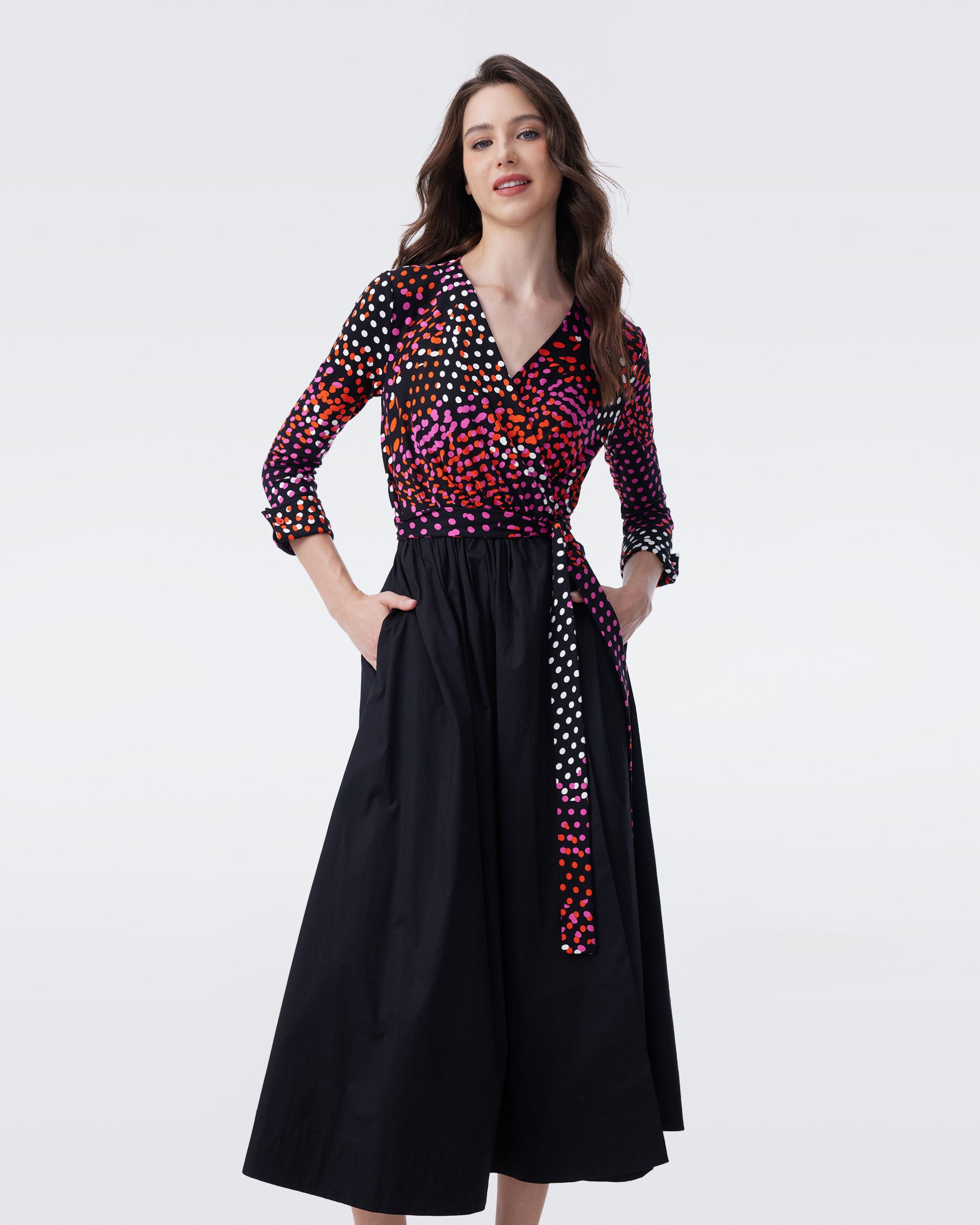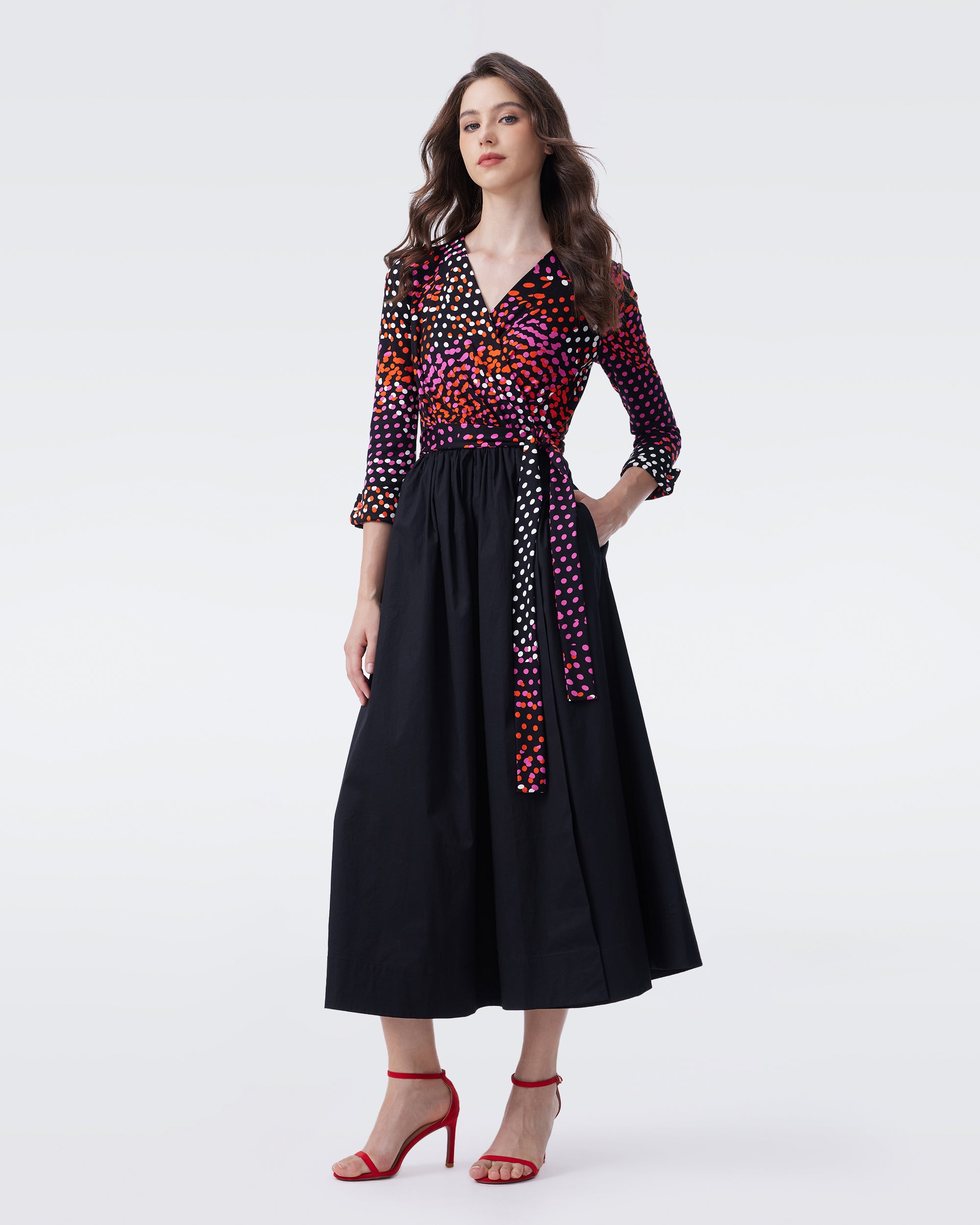 Fitted top flatters curves; flared skirt adds flow. Wrap design boosts elegance/sexiness. Adjustable waist tie, cuffed 3/4 sleeves, side pockets. Romantic yet neat.