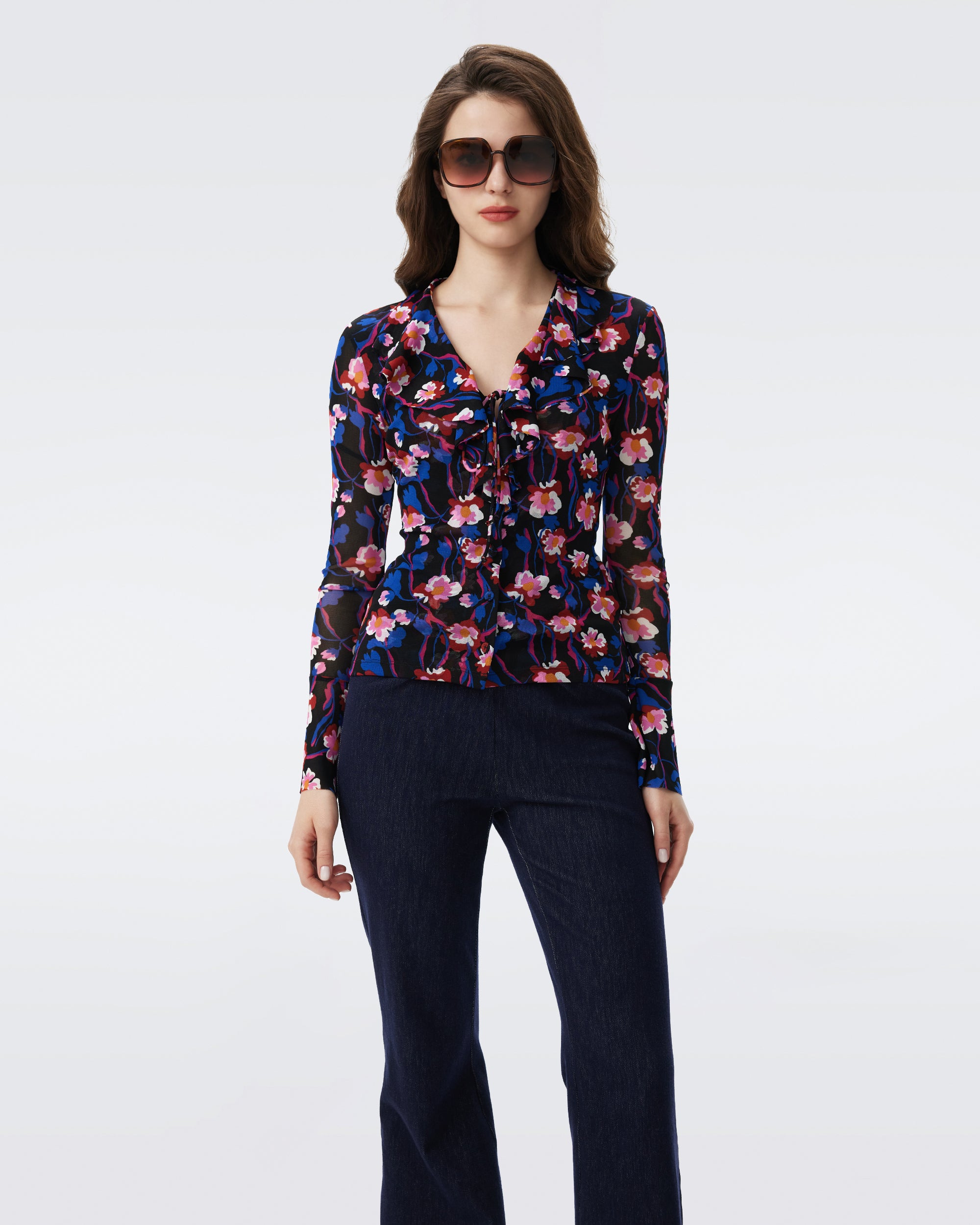 Made of lightweight mesh fabric—soft, smooth, slightly sheer for a hazy beauty. Black base with colorful floating - flower prints, romantic and stylish. Slim fit, V - neck shows curves. Ruffles add sweetness. Pair with jeans for outings, or skirts/heels for parties.