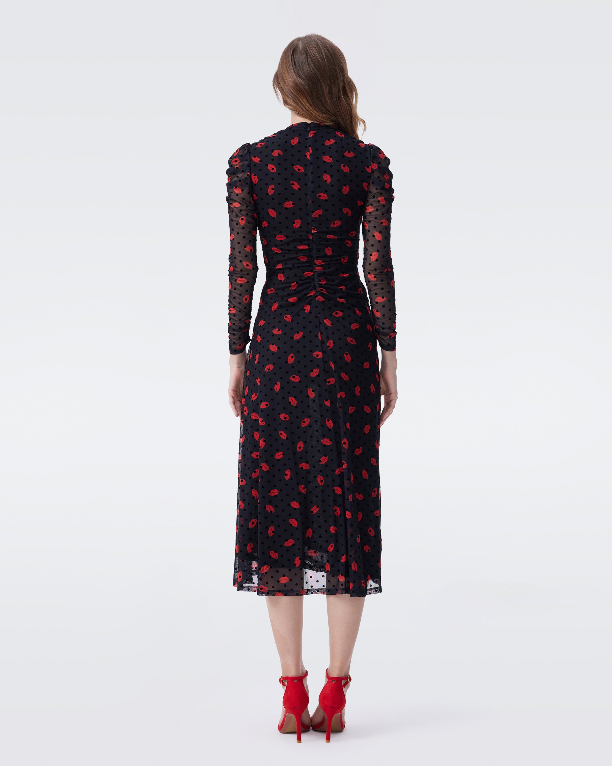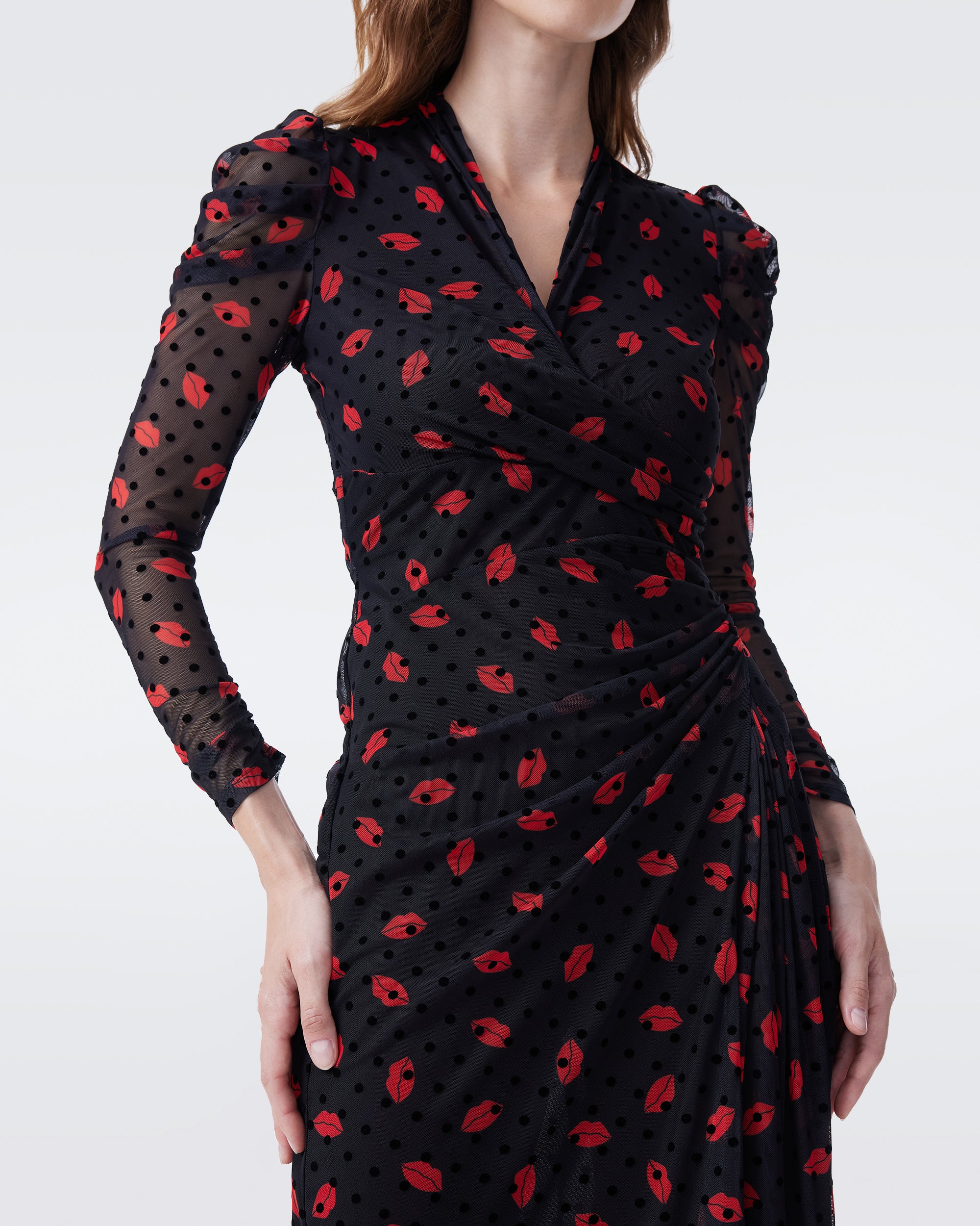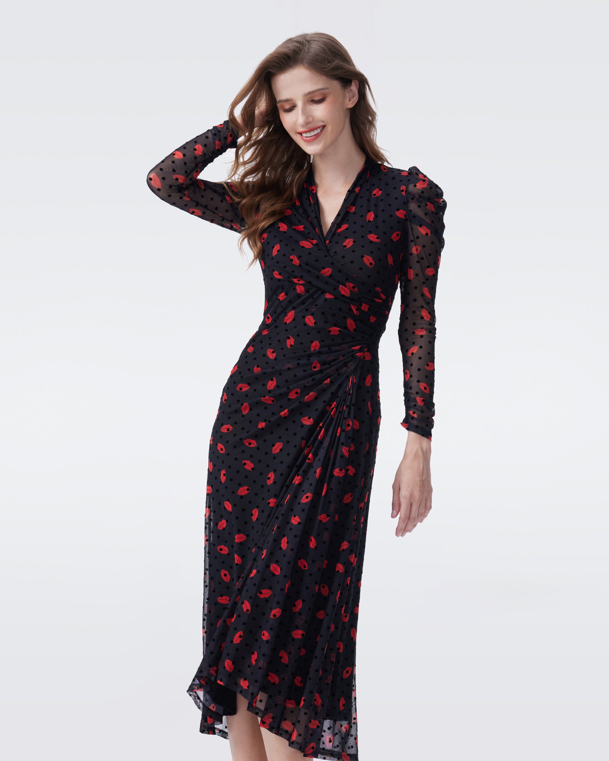This fitted midi dress shows curves well. V-neck flatters the neck, adding elegance. Long puffed sleeves are retro, cute and layered. Side pleats and uneven hem make it eye-catching.Flocked stretch mesh: light, see-through, stretchy.