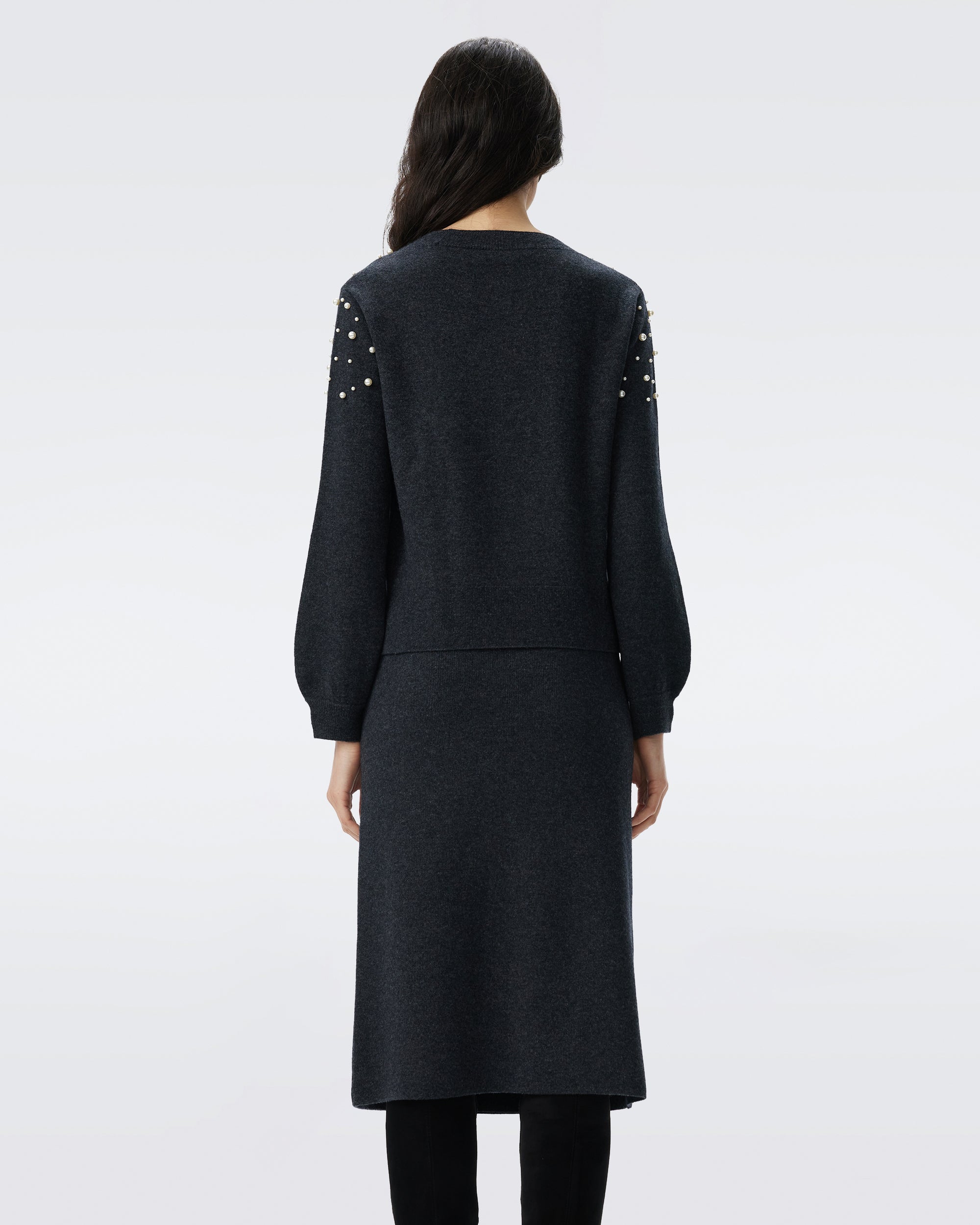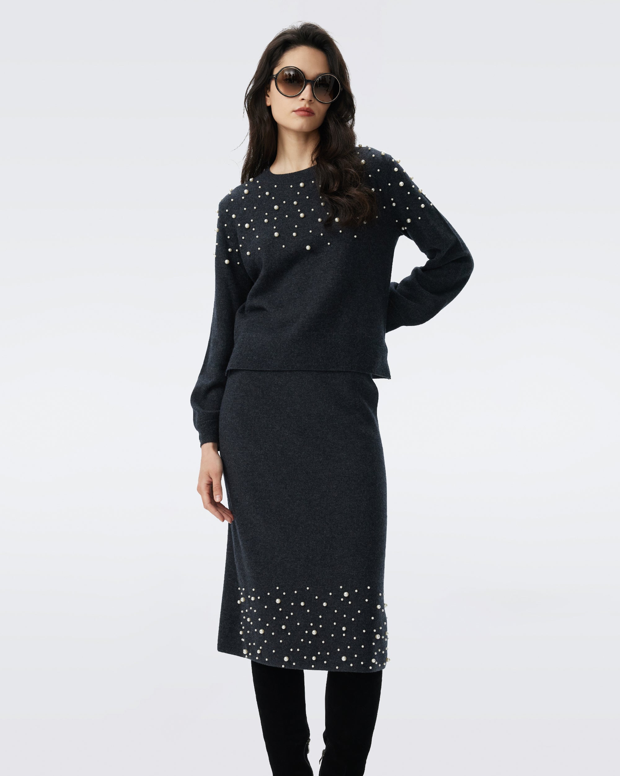 A cropped crew-neck sweater with a simple and neat design. Knitted fabric, soft and skin-friendly with good elasticity and warmth retention. It perfectly showcases the silhouette and decorative details, creating an exquisite texture.