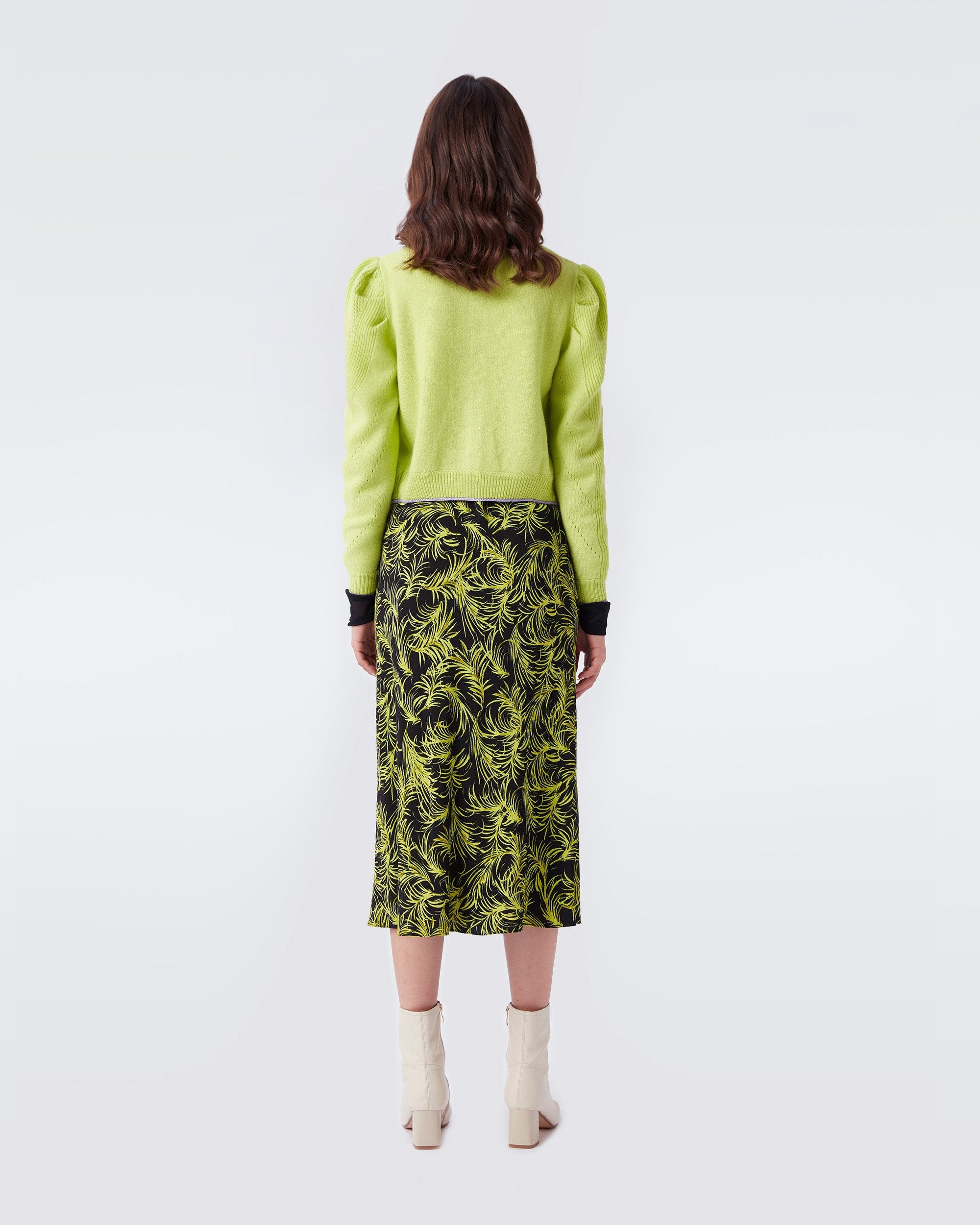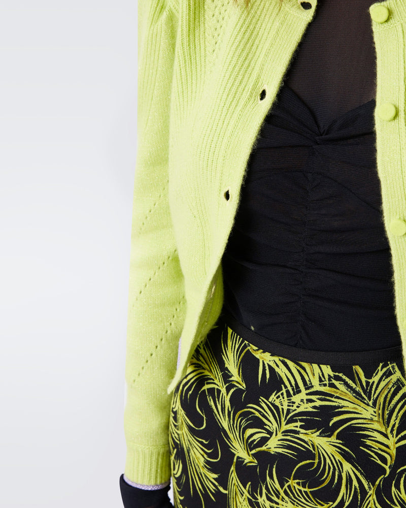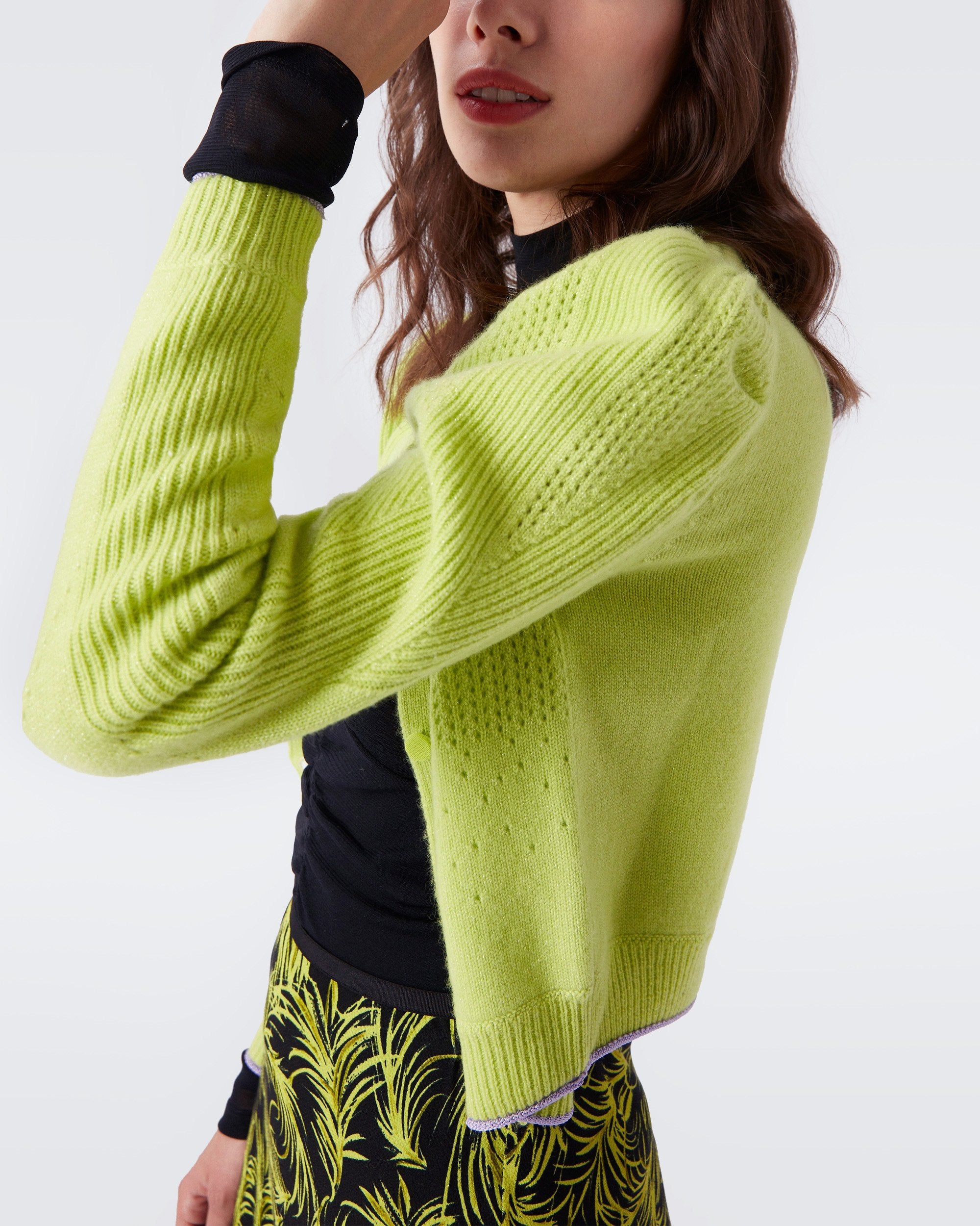 A round collar knit cardigan with fabric covered buttons, the Timmy couldn?t be cozier. Its comfy-chic look is balanced with edgy details like a criss-crossed jacquard pattern along the body, puffed shoulders, and contrast piping along the hem and cuffs. Wear it open with a bustier and jeans or button it up and wear it with pants for an easy daytime look.